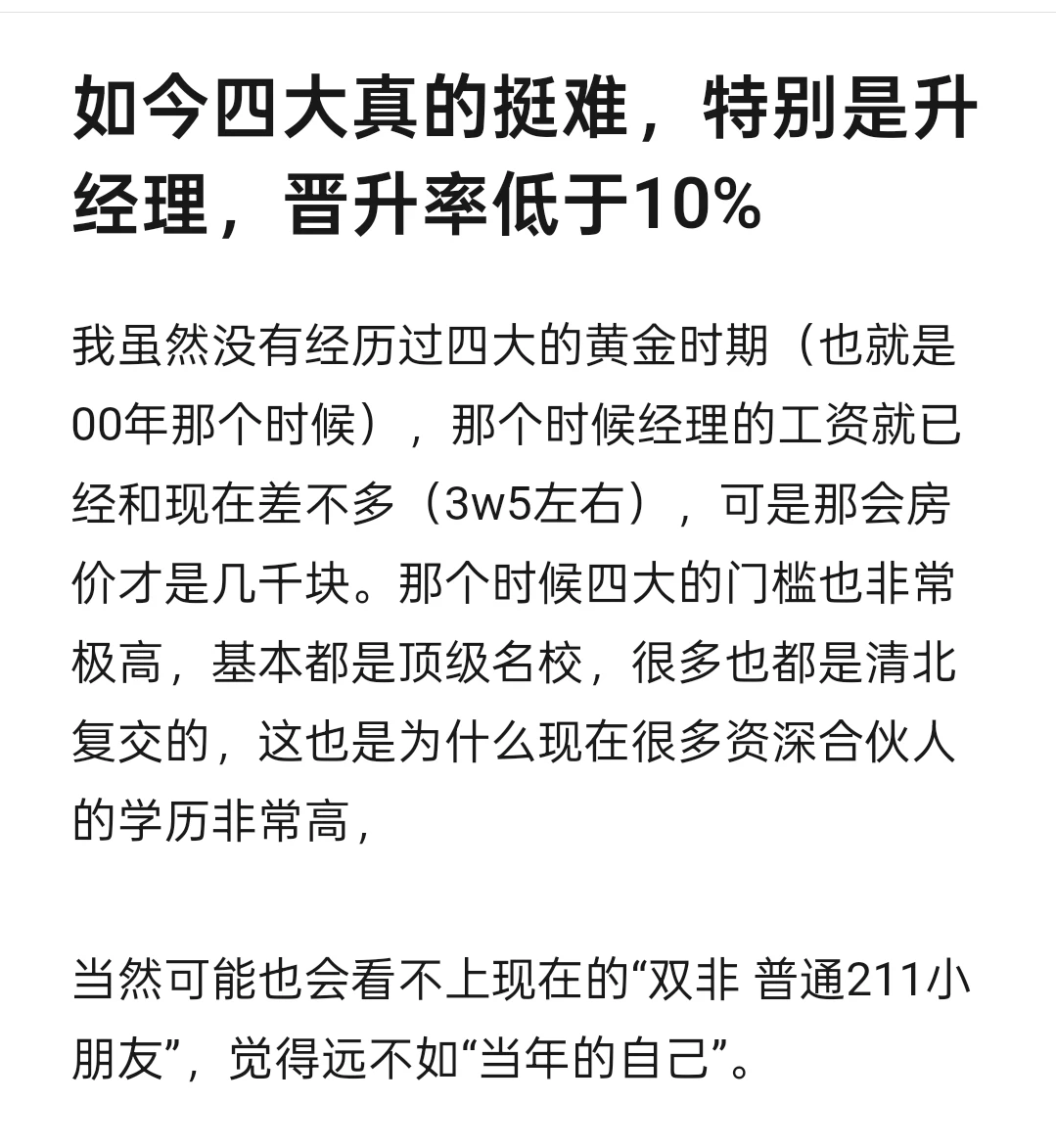 所以现在在四大升经理,已经很厉害了,但是甲方又会觉得“性价比不高”“贵”“乙方思维太重”,有时候真的是发出一声苦笑,