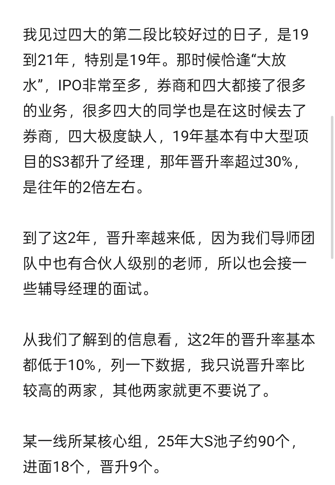 我见过四大的第二段比较好过的日子,是19到21年,特别是19年。那时候恰逢“大放水”,IPO非常至多,券商和四大都接了很多的业务,很多四大的同学也是在这时候去了券商,四大极度缺人,19年基本有中大型项目的S3都升了经理,那年晋升率超过30%,是往年的2倍左右。
