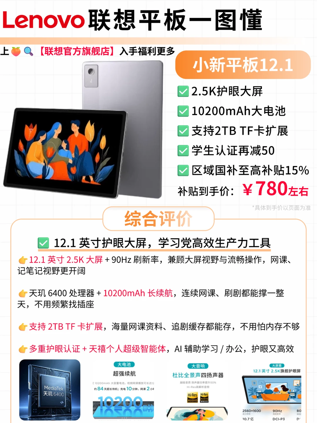 ✨12.1 英寸 2.5K 大屏视野开阔,90Hz 刷新率操作流畅,支持 2TB 扩展可存海量资料,天玑 6400 处理器日常使用够用,多重护眼 + 天禧 AI 让学习更便捷