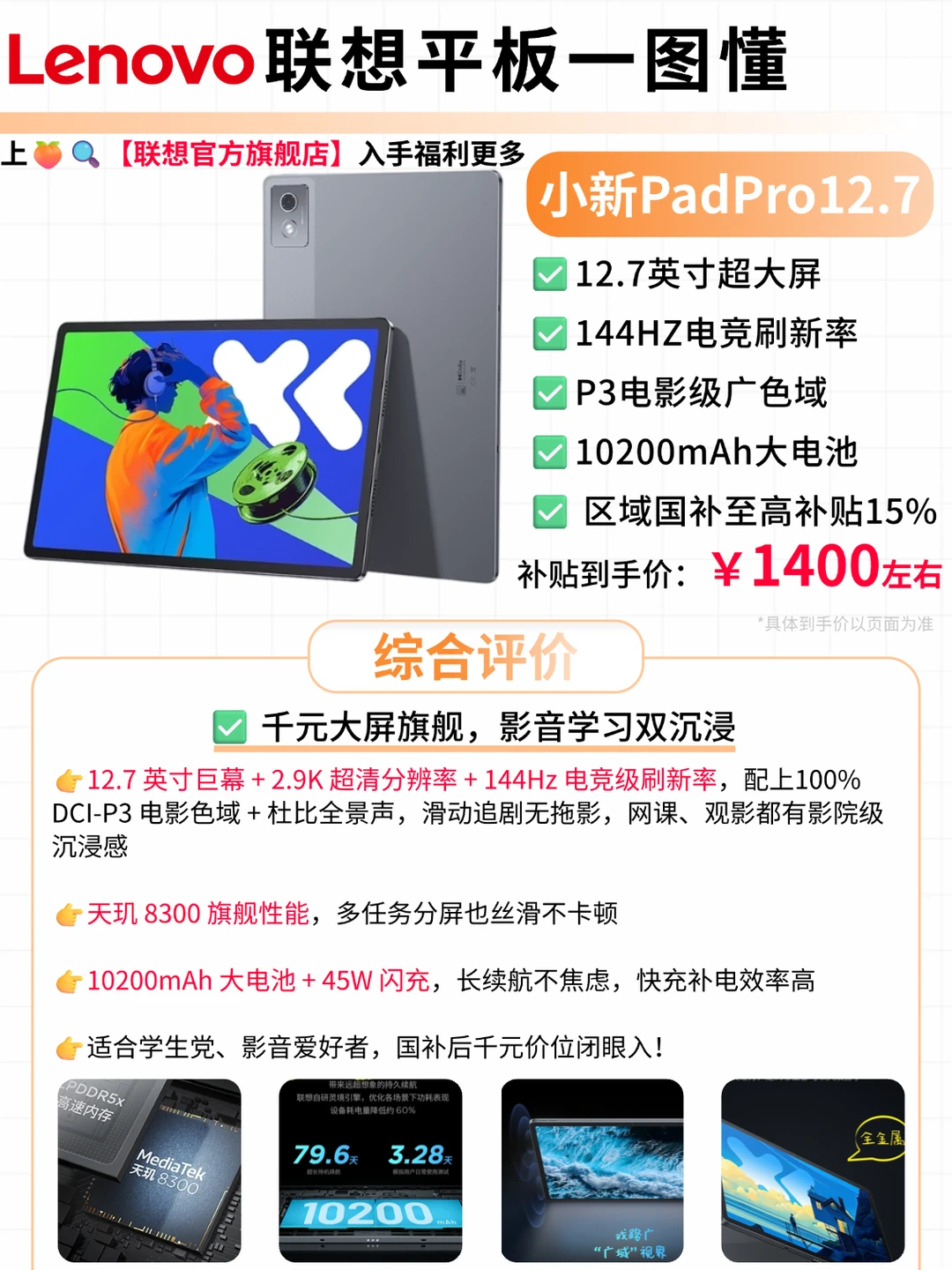 🔹 小新 Pad Pro 12.7 : 大屏影音党专属