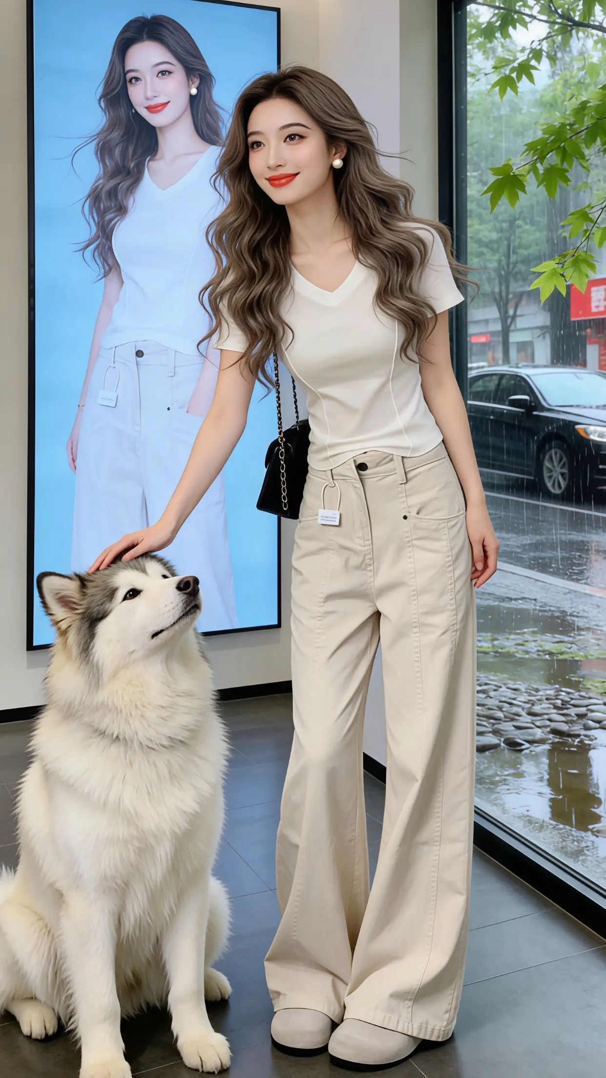 一组休闲与优雅兼备的完美穿搭,黑色小皮草外套搭配白色上衣,突显好身材,简洁不简单