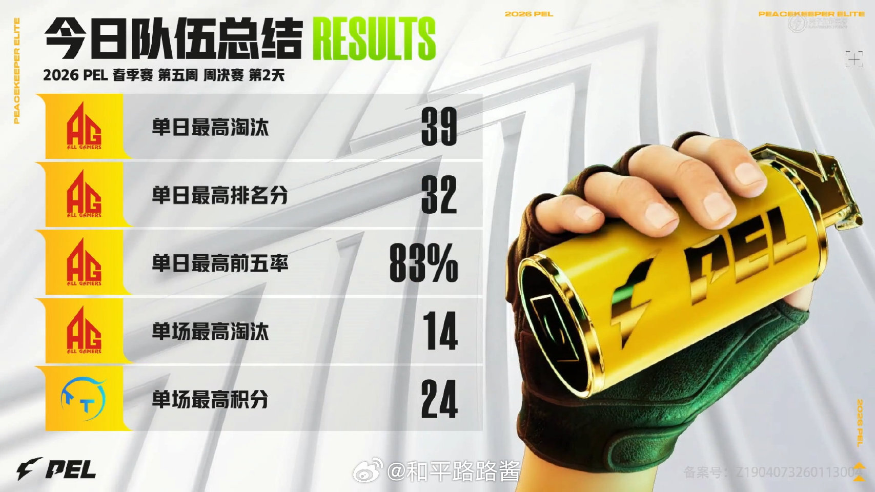 队伍数据:单日最高淘汰:39单日最高排名分:32单日最高前五率:83%单场最高淘汰:14单场最高积分:24