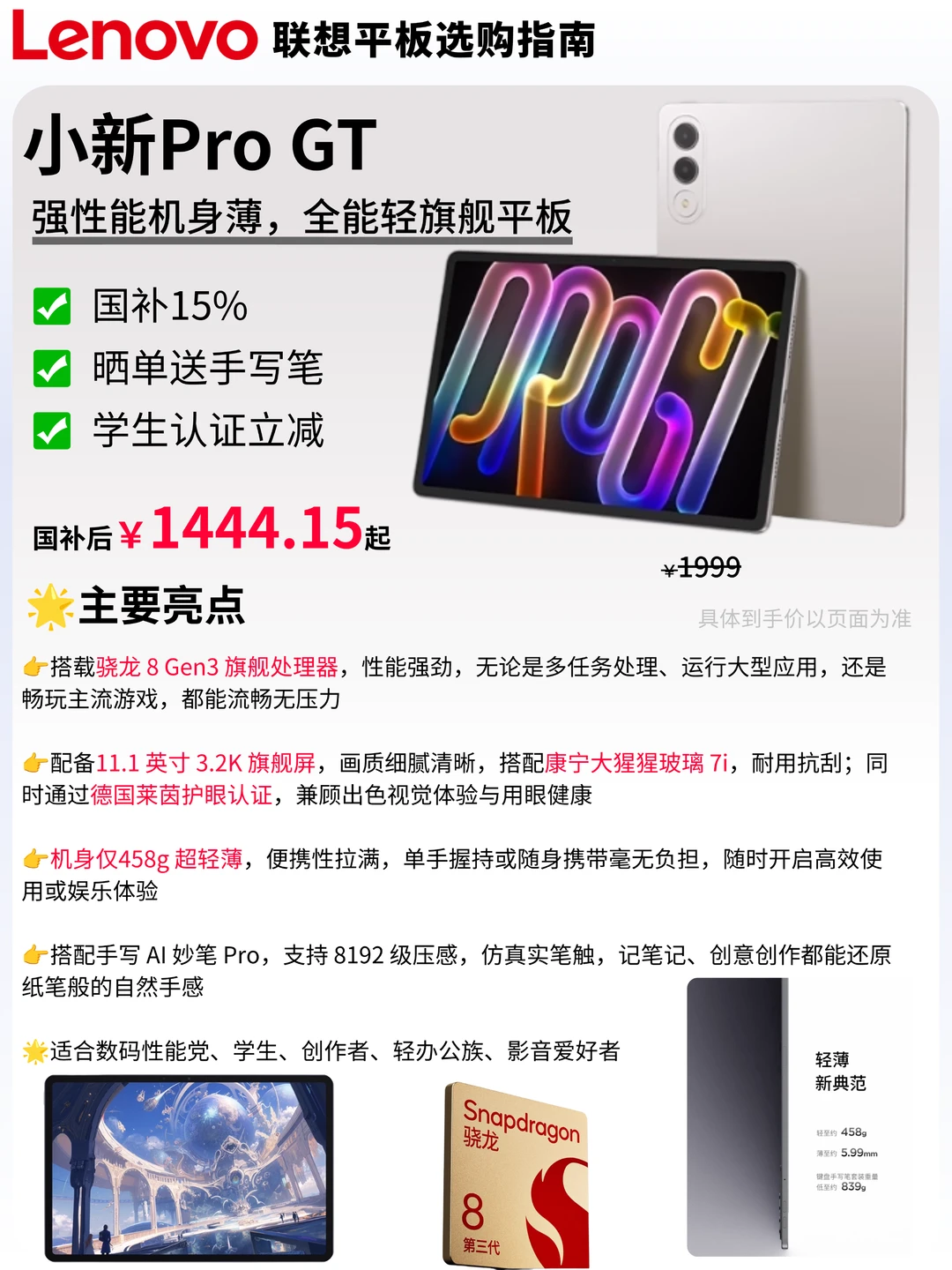 🔹 小新平板 Pro GT : 全能轻旗舰