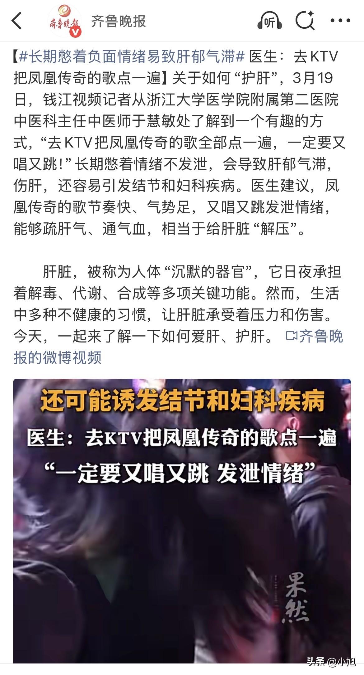浙大二院的中医主任于慧敏,这两天说了句大实话:想护肝,就去KTV把凤凰传奇的歌全部点一遍,必须又唱又跳。