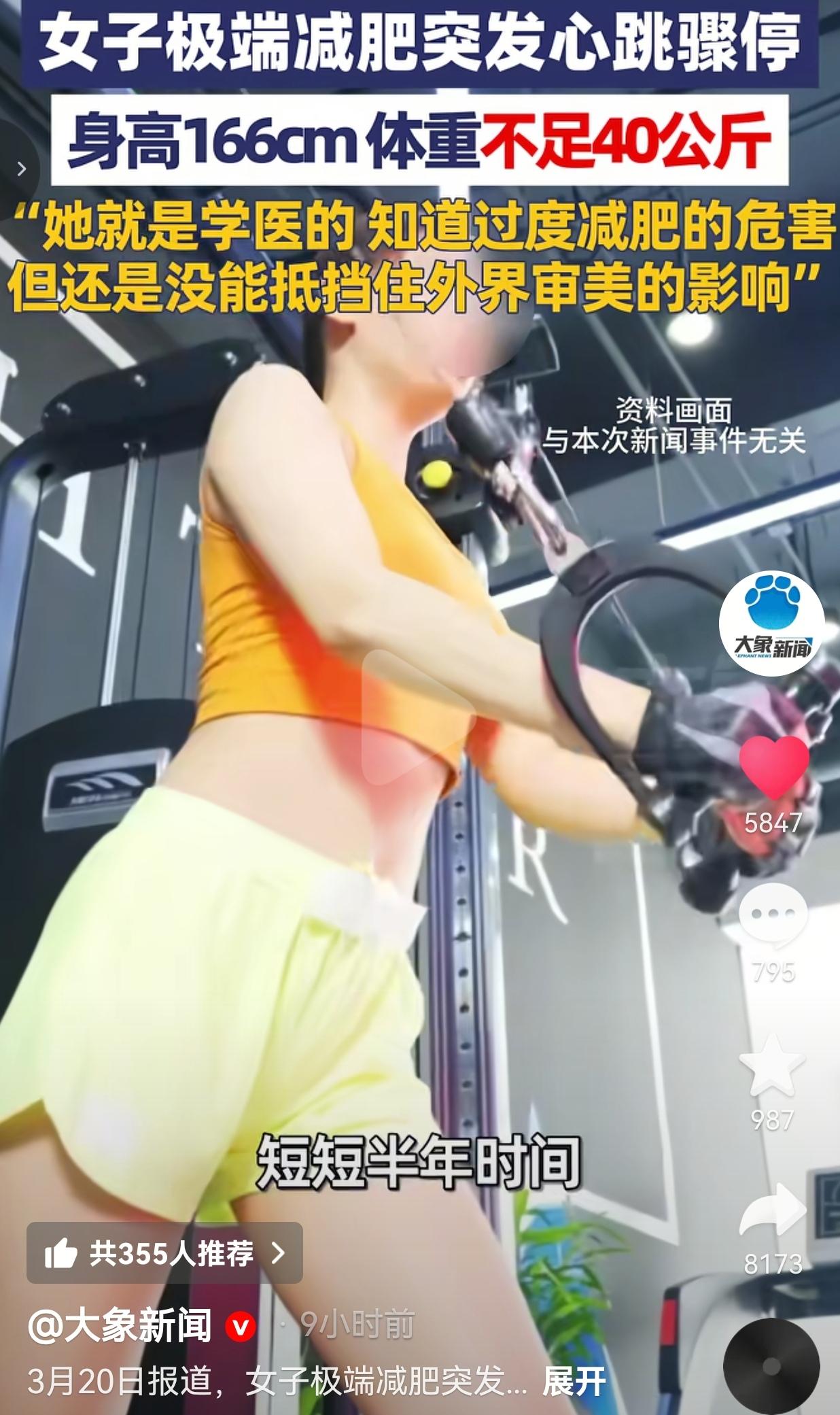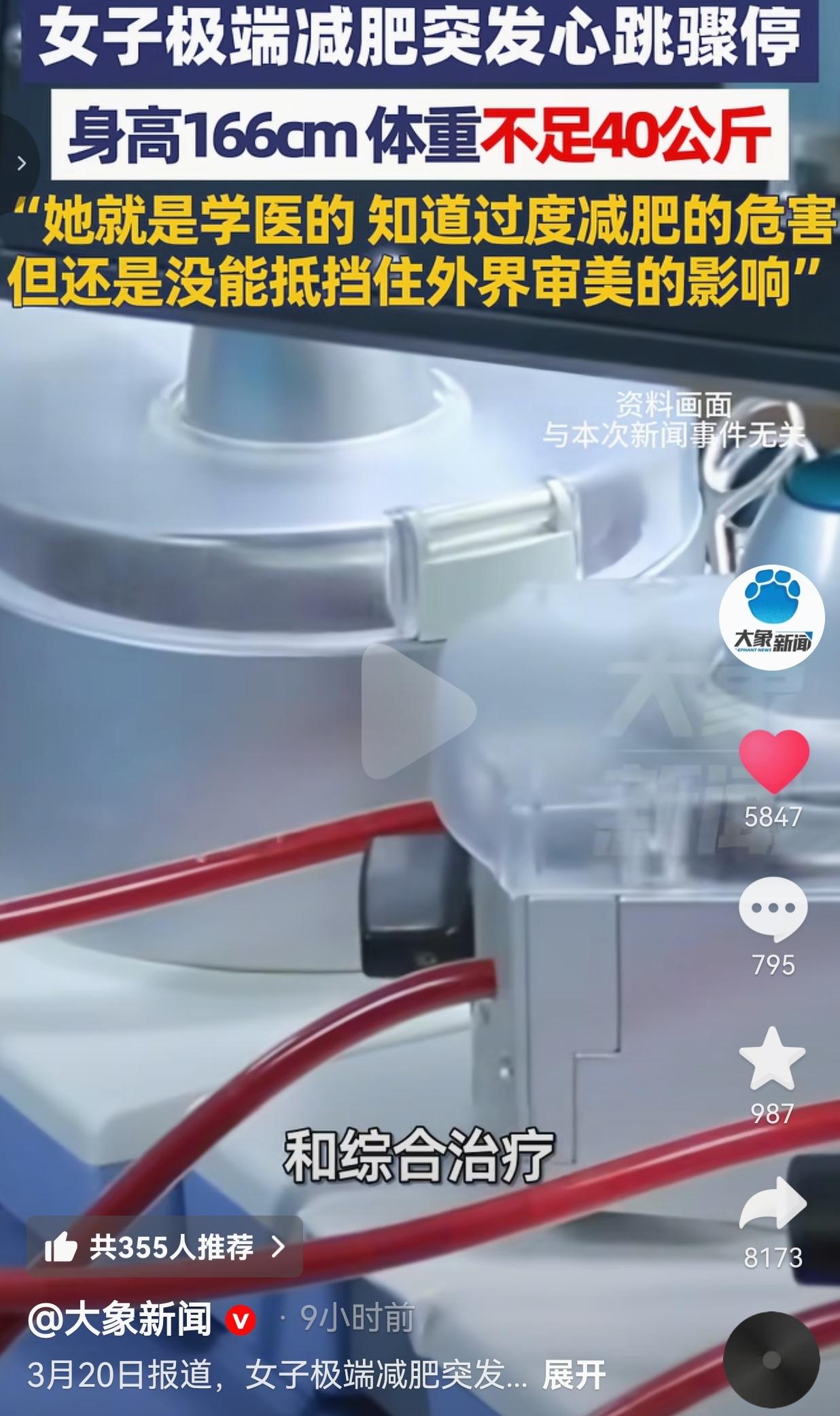 学医的姑娘都能被瘦到心跳骤停!这畸形审美到底要逼死多少人?! 武汉24岁姑娘思思,用半条命给所有减肥疯魔的人敲了个警钟! 24岁,学医的,身高166,原本100斤,健康得很!就被“白幼瘦”那套鬼话洗脑,开始玩命减肥:一天只啃几口菜叶子,饿到眼冒金星;往死里运动,就为那点破“骨感美”。半年干到不到80斤,瘦得只剩一把骨头! 更讽刺的是——她明明学医,比谁都懂节食会要命,可还是抵不住“瘦才好看”的破舆论,把自己往鬼门关里送! 就在地铁站,她突然呼吸心跳骤停,“啪”地栽倒在地!送进ICU,靠机器撑了整整7天,跟死神拔河,才捡回一条命! 你说可笑不可笑?救死扶伤的人,差点死在自己手里,就为了迎合别人眼里的“美”! 网友看到后评论说:“我也是学医的!看到姑娘们饿到晕倒,真想抽醒她们!健康没了,再瘦有屁用?!” 也有的网友说:“破防了!我之前也饿到头晕,现在想想真后怕!思思这是拿命给我们上课啊!” 也有的网友说:“别被“白幼瘦”PUA了!健康线条才是美!饿出来的瘦,全是病!” 还有的网友说:“连学医的都扛不住,可见这畸形审美多害人!网红别再贩卖身材焦虑了!” 我看完气得手都抖!这哪是减肥?这是自残!是被畸形审美绑架的自杀! 我们天天喊“美是多元的”,可现实里多少姑娘被“体重不过百”“瘦才高级”逼疯? 思思懂所有医学常识,还是败给了外界眼光——这才最可怕:当“瘦”成了政治正确,连专业知识都干不过一句“你该减肥了”! 别跟我扯什么“自律”“管理身材”,饿到心跳骤停、进ICU靠机器续命,这叫愚蠢,叫被焦虑绑架! 真正的美,从来不是骨瘦如柴,是眼里有光、身体有劲,是能跑能跳、能好好吃饭的鲜活! 别再让“白幼瘦”绑架我们了!别再让姑娘为了别人的眼光,赔上健康甚至性命!健康才是最高级的美,活着才配谈好看! 最后,我想说的是:瘦到进ICU的美,一文不值;能好好吃饭、好好活着的你,才最耀眼! 对此,你怎么看? 信息来源:大象新闻