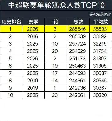 2026中超第3轮打破十年纪录,球迷总结的原因十分有趣。[捂脸][捂脸] 据德转管理员统计,本轮中超观众总人数达285546人,创造了中超单轮上座人数新纪录,此前纪录是2016赛季第二轮比赛的265539人。 金元时代已然过去,中超历经阵痛期,似乎再度迎来盛世,球市也愈发红火。 足球的关键并非球星,也不是大牌,而是对这项运动、对家乡球队的热爱。 实际上,专业足球场贡献颇大,毕竟观赛体验良好。 只是本轮中超缘何会破纪录呢? 有球迷如此总结: 1、成渝德比 2、京沪德比 3、大连主场 4、海港客场 的确,成都蓉城、北京国安和大连英博这三个主场的观众总人数占据了大半,只是加上“海港客场”,这是什么梗? *第3轮中超现场观众人数 大连英博1 - 0上海海港:58337人 青岛海牛1 - 4浙江:22305人 北京国安1 - 1上海申花:64118人 辽宁铁人3 - 0天津津门虎:25069人 河南1 - 1武汉三镇:20528人 重庆铜梁龙3 - 3成都蓉城:55868人 青岛西海岸1 - 0深圳新鹏城:15633人 云南玉昆4 - 0山东泰山:23688人 按照赛程安排,2026赛季还有机会再创新高吗? 第8轮或许有机会,成都蓉城、北京国安、重庆铜梁龙和大连英博都将坐镇主场,这四队球市不错、颇具潜力,但能否破纪录,就得看球迷是否给力了。