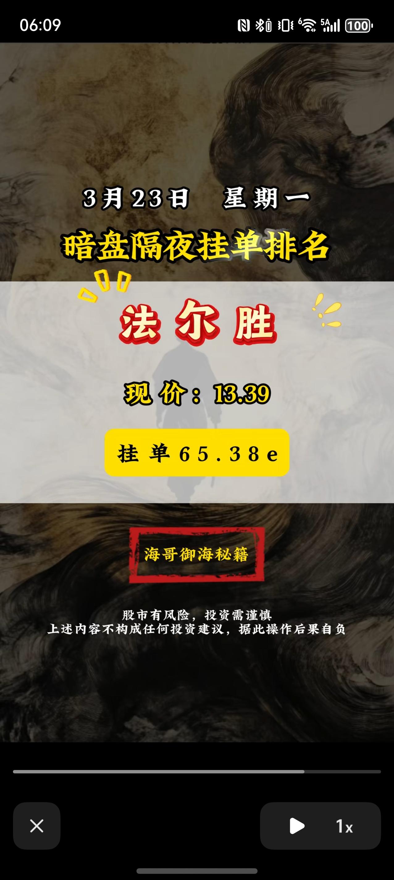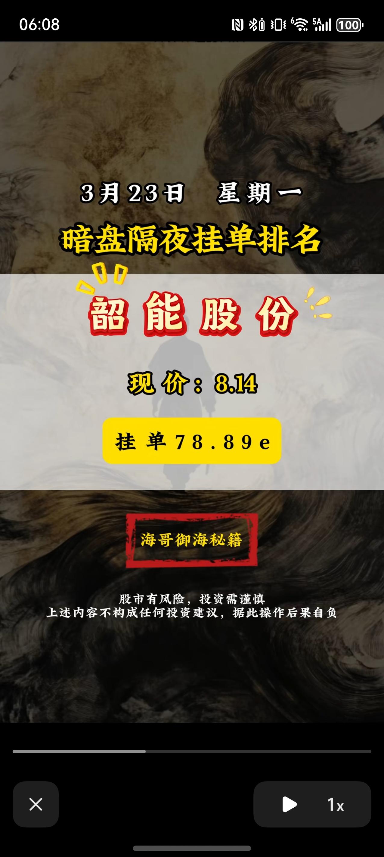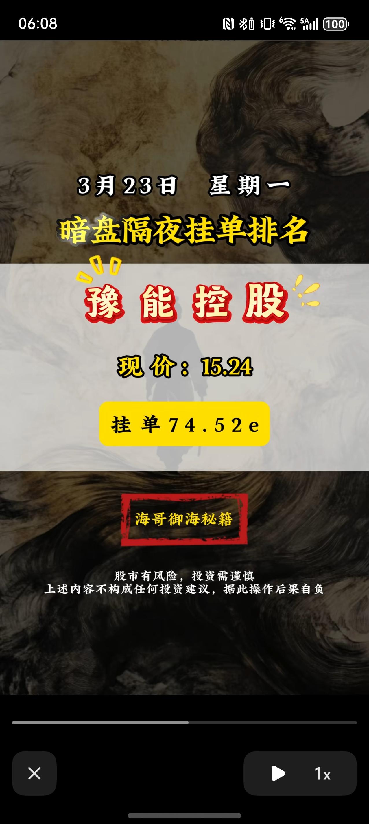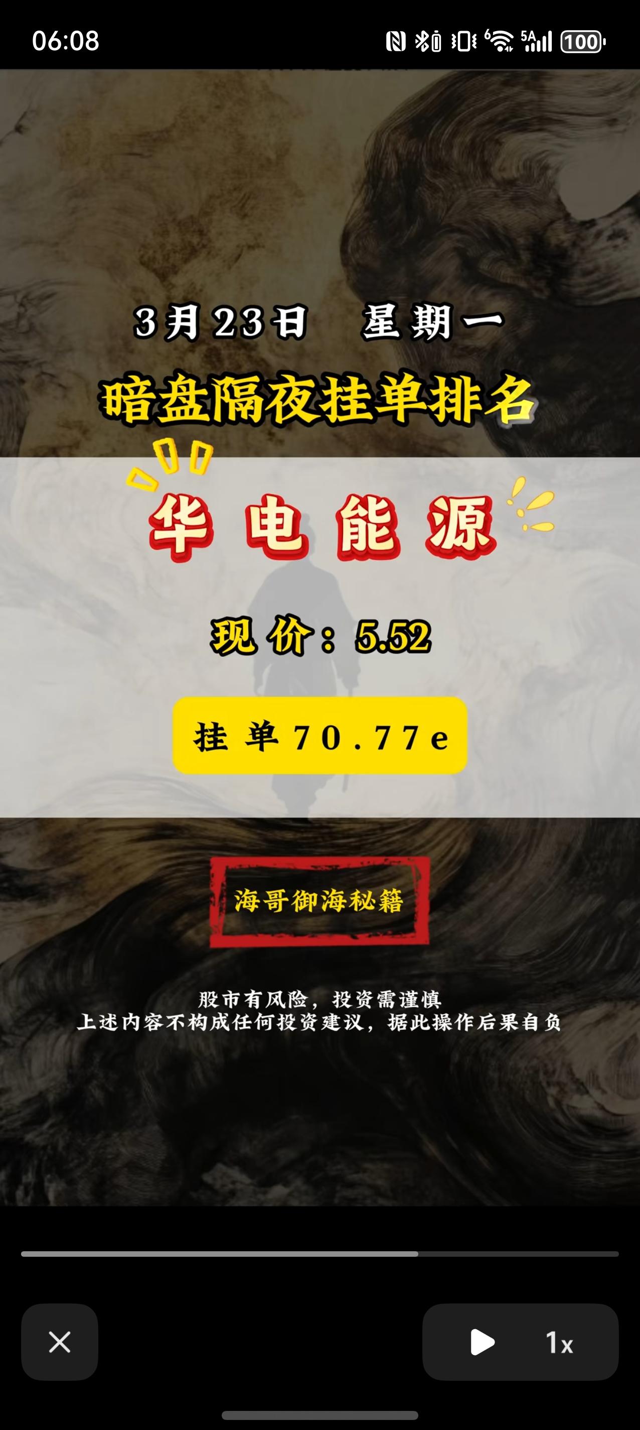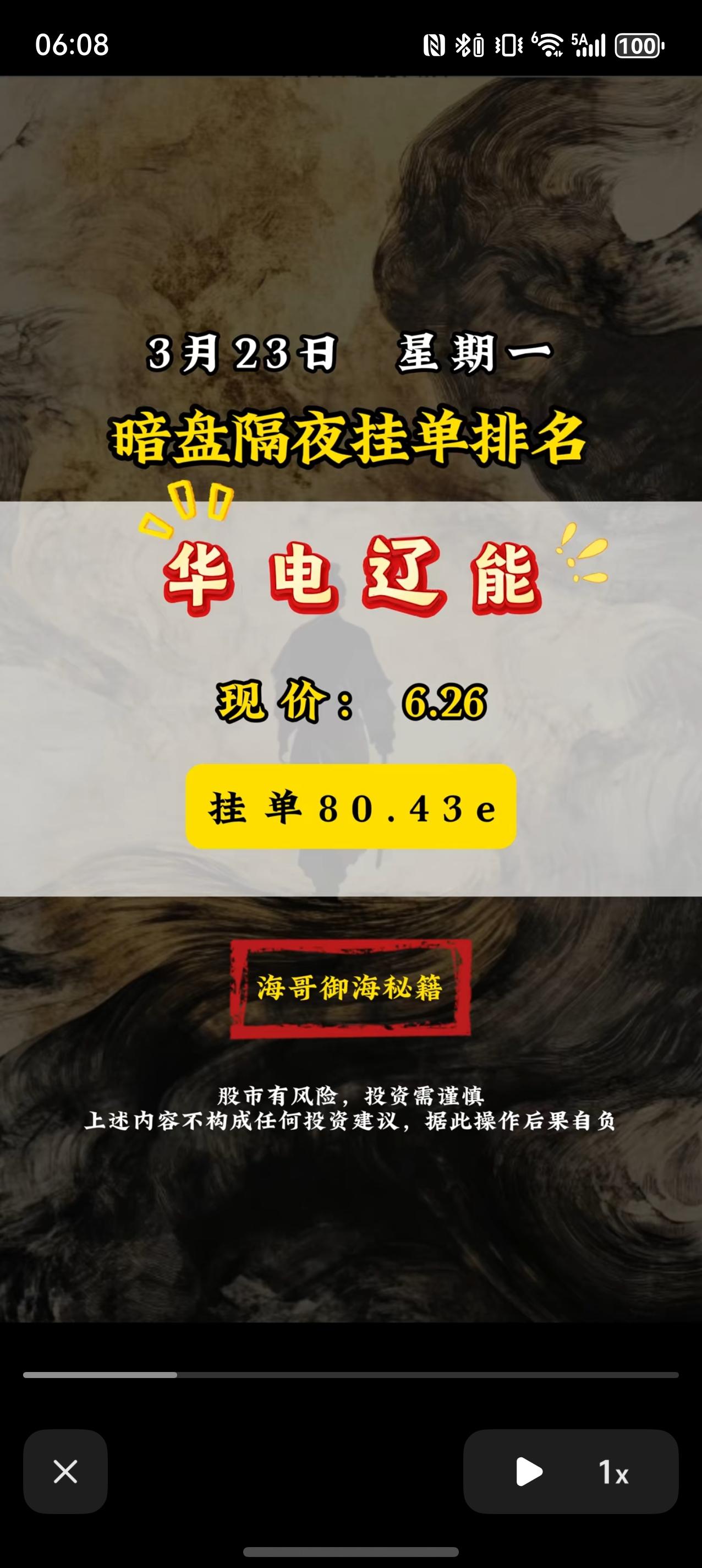 3月23日,下周一A股暗盘隔夜挂单排名解析!!! 这组数据展示了3月23日部分个股的暗盘隔夜挂单情况,挂单金额从59.42亿到80.43亿不等,反映出资金对能源类个股的高度关注。 从个股来看,华电辽能挂单金额最高(80.43亿),其次是韶能股份(78.89亿)、豫能控股(74.52亿),均属于能源电力赛道,体现出资金对能源板块的集中偏好。这类大额挂单往往源于市场对行业利好的预期,如政策扶持、业绩改善等,但需注意暗盘挂单仅反映盘前情绪,实际开盘后走势仍受大盘环境、资金博弈等多重因素影响!!!股市分析