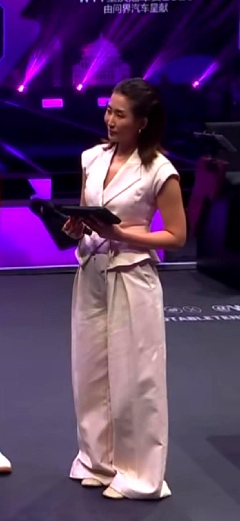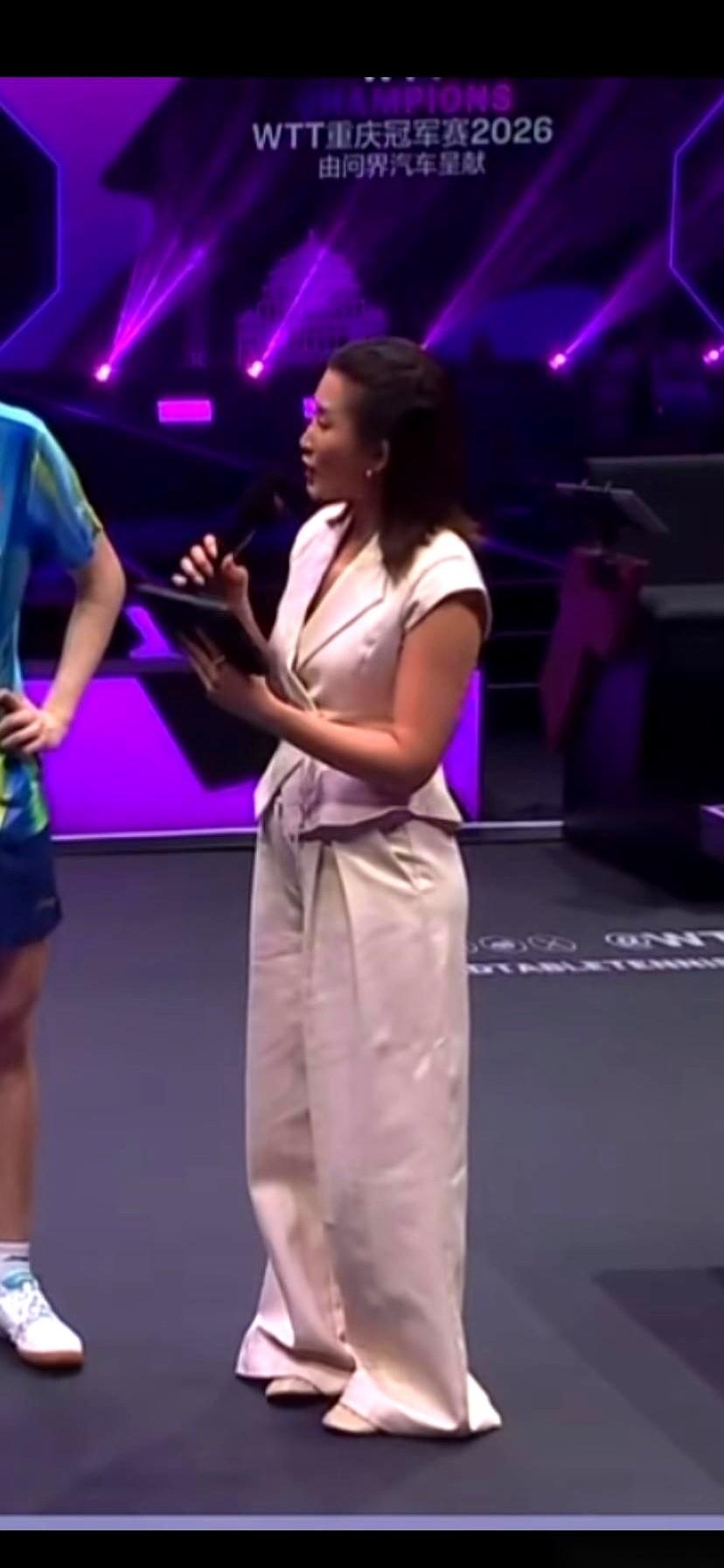 重庆WTT冠军赛,镜头猛地切到赛后采访区。 一个女主持站了出来。 本来是运动员的主场,结果全场的焦点,好像瞬间被她那条裤子给吸走了。 一条米白色的阔腿裤,材质软塌塌的,长得离谱,整个裤脚乱糟糟地堆在地上,把鞋子盖得严严实实。 赛场那种明晃晃的顶光一打下来,这身浅色不仅没提气,反而整个人显得灰扑扑的,毫无光彩。 镜头拉个半身还好,一切到全身,旁边站着一身劲装、精神抖擞的运动员,那个对比就出来了。她整个人像是被那条裤子往下拽着,所有的利落感和专业气场,全被裤脚那堆褶子给拖垮了。 感觉就像在一部高速运转的机器里,突然掉进去一团棉花。 不是说这身衣服不好看,就是不对劲。 那个争分夺秒的赛场,需要的是一种绷着弦的精气神,她这身穿搭,给人的感觉却是周末下午三点半的咖啡馆。 说白了,这不是审美分歧,这是在工作场合,穿了一件错误的“制服”。