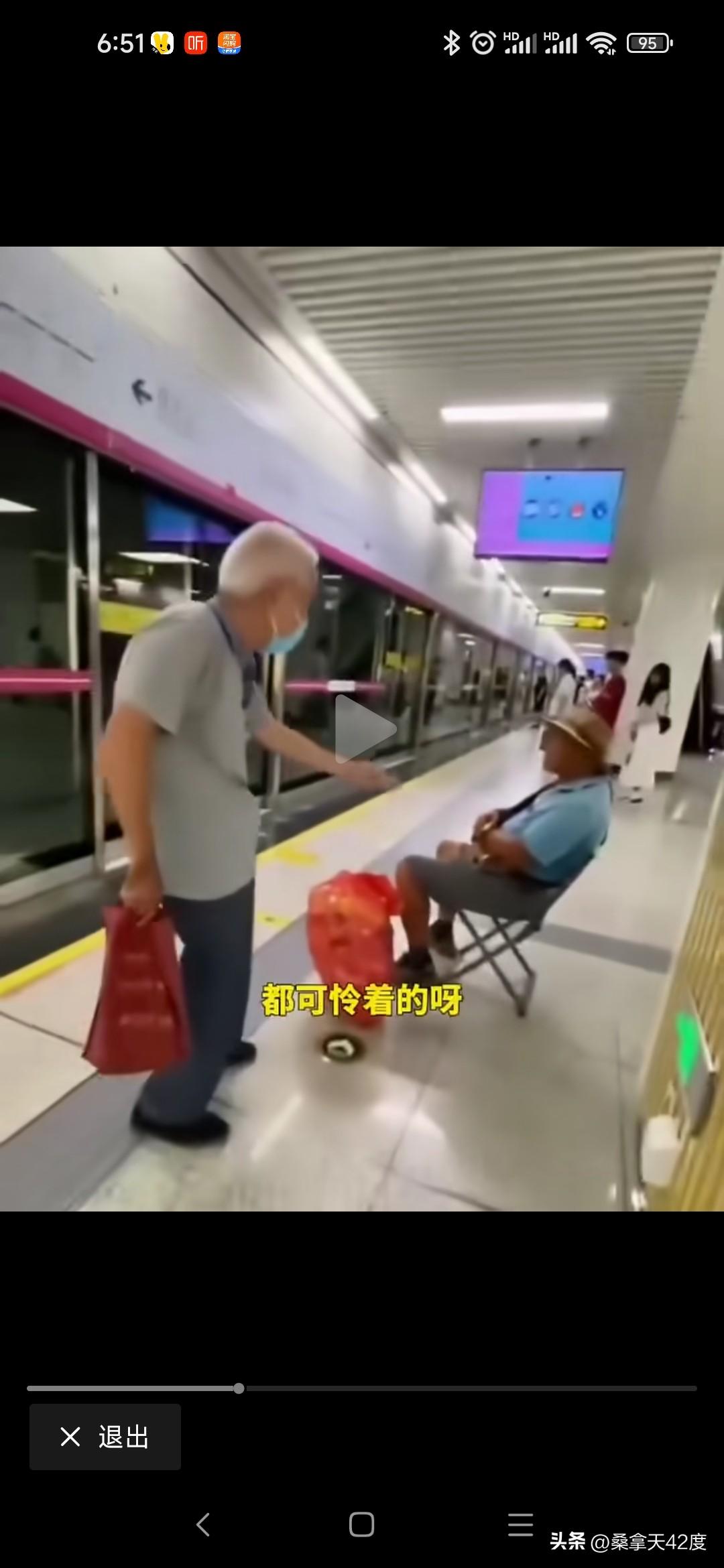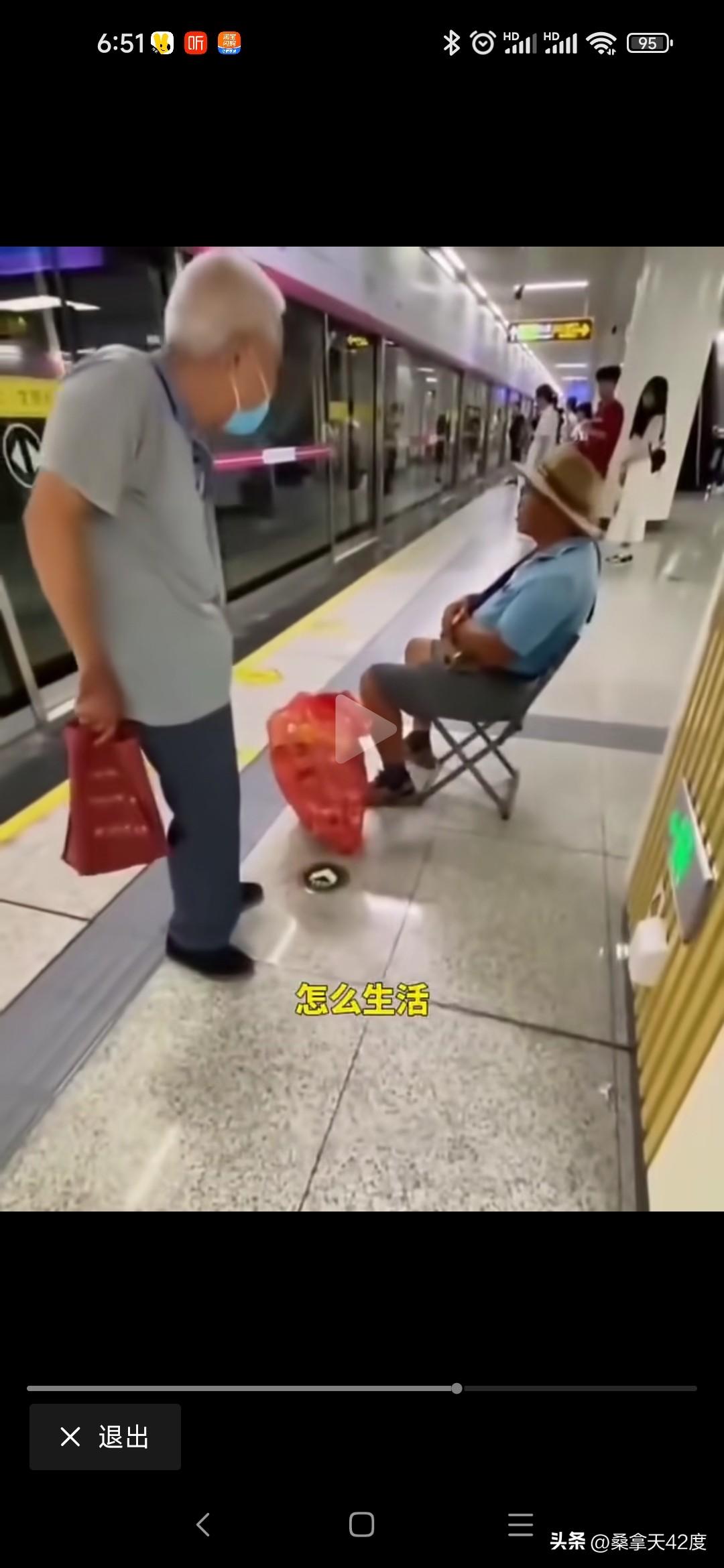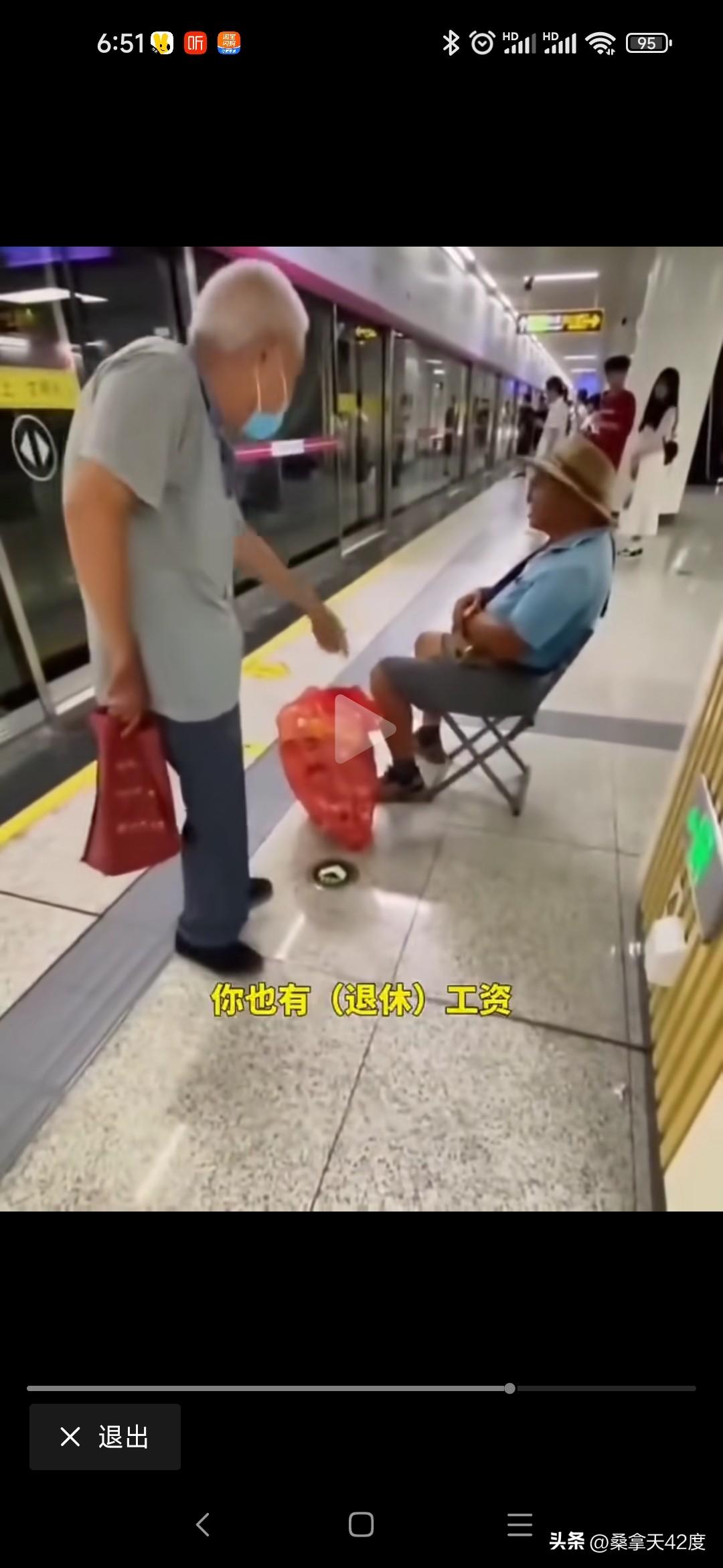 背包大爷看到坐马扎大爷坐在地铁站内,讨厌矿泉水瓶,得知马扎大爷有退休金不是无助之人。