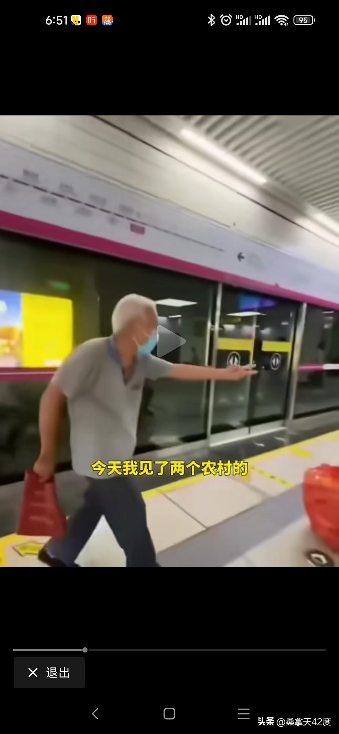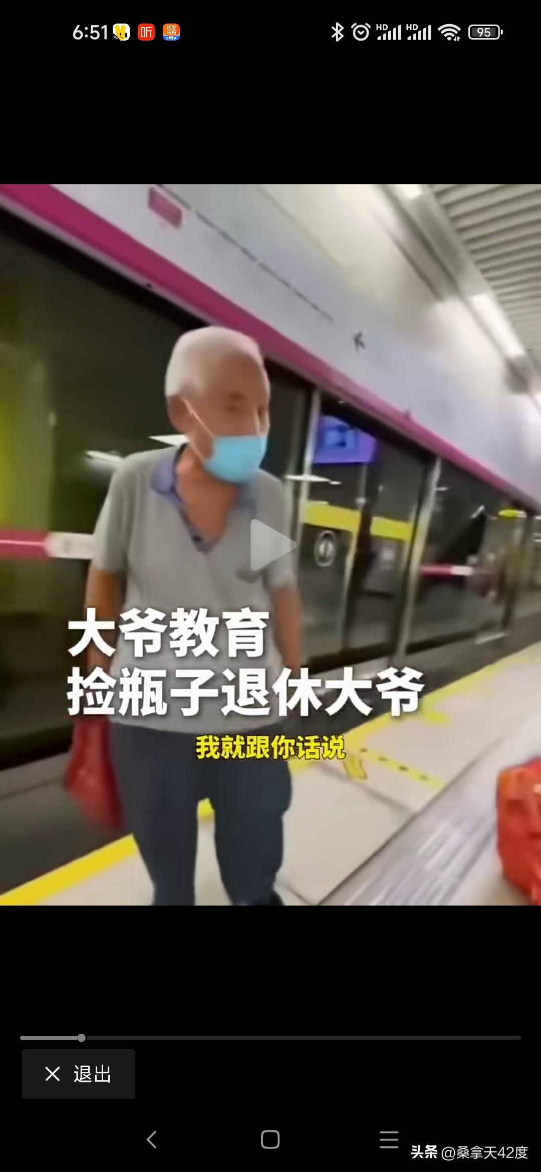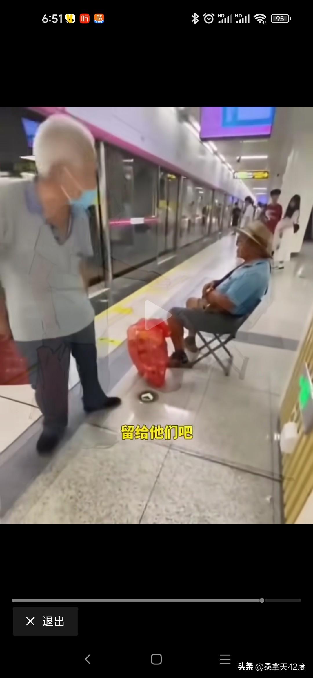 背包大爷看到坐马扎大爷坐在地铁站内,讨厌矿泉水瓶,得知马扎大爷有退休金不是无助之人。