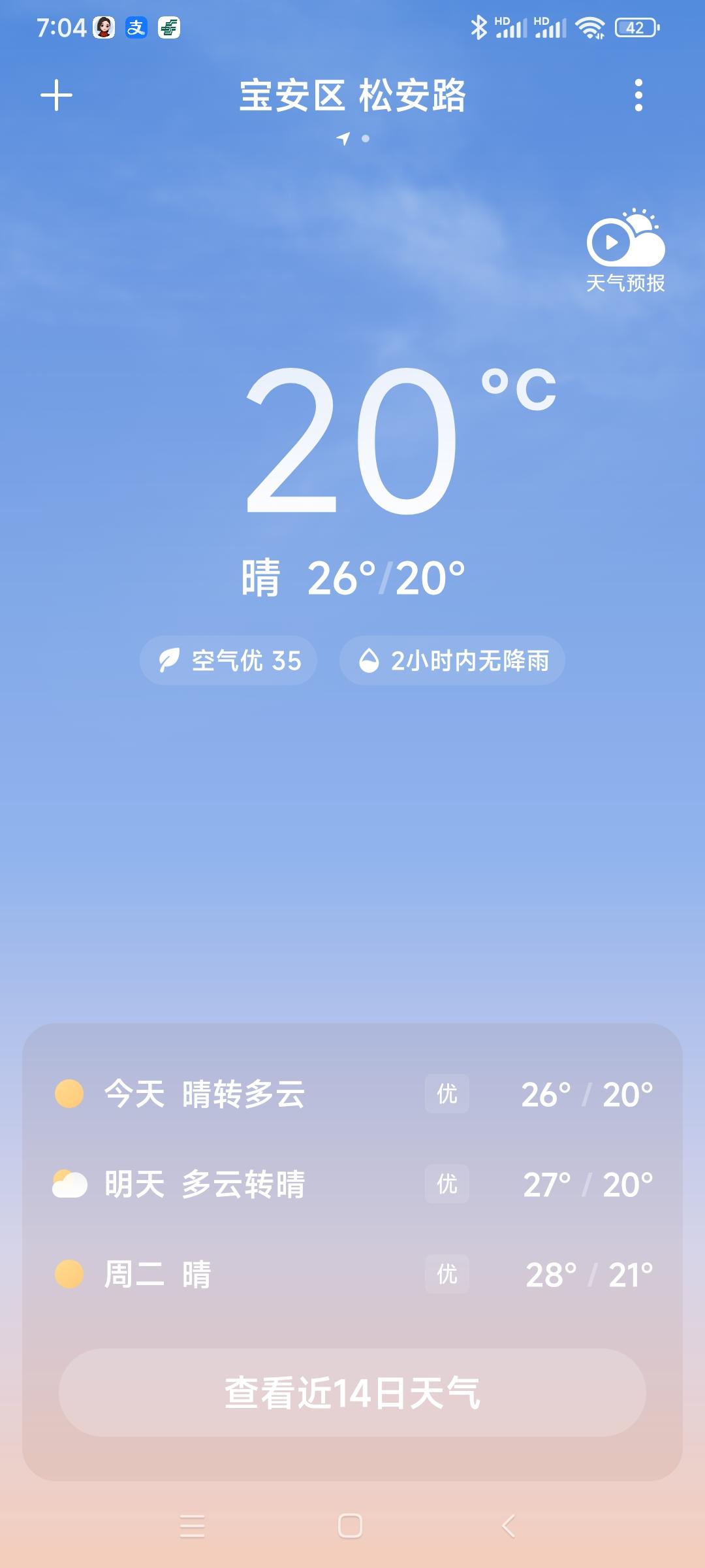 我的今日状态:😁轻松愉快 我这里的天气:☀️晴天:深圳今日晴转多云,气温20度