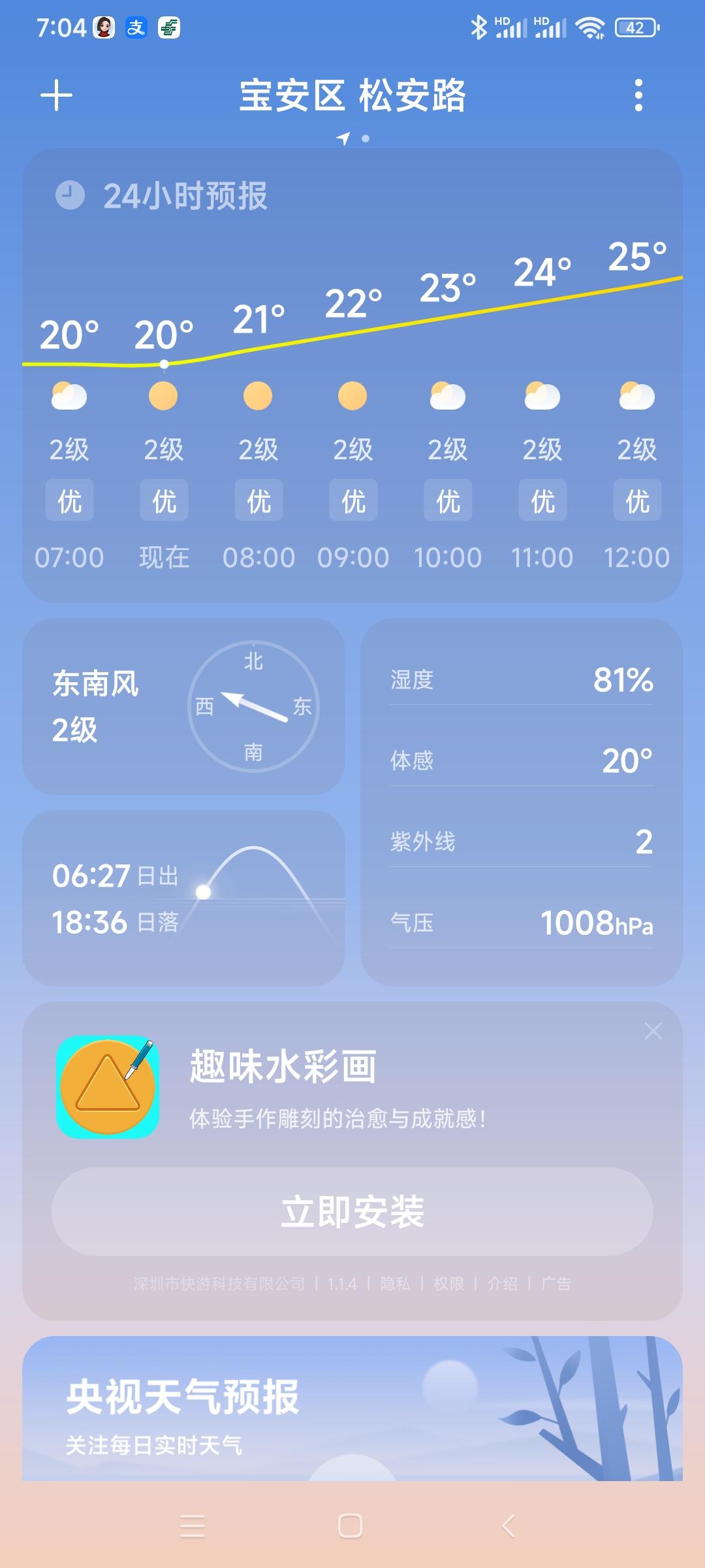 我的今日状态:😁轻松愉快 我这里的天气:☀️晴天:深圳今日晴转多云,气温20度到26度,湿度81度!大家早上好,周末愉快[作揖]
