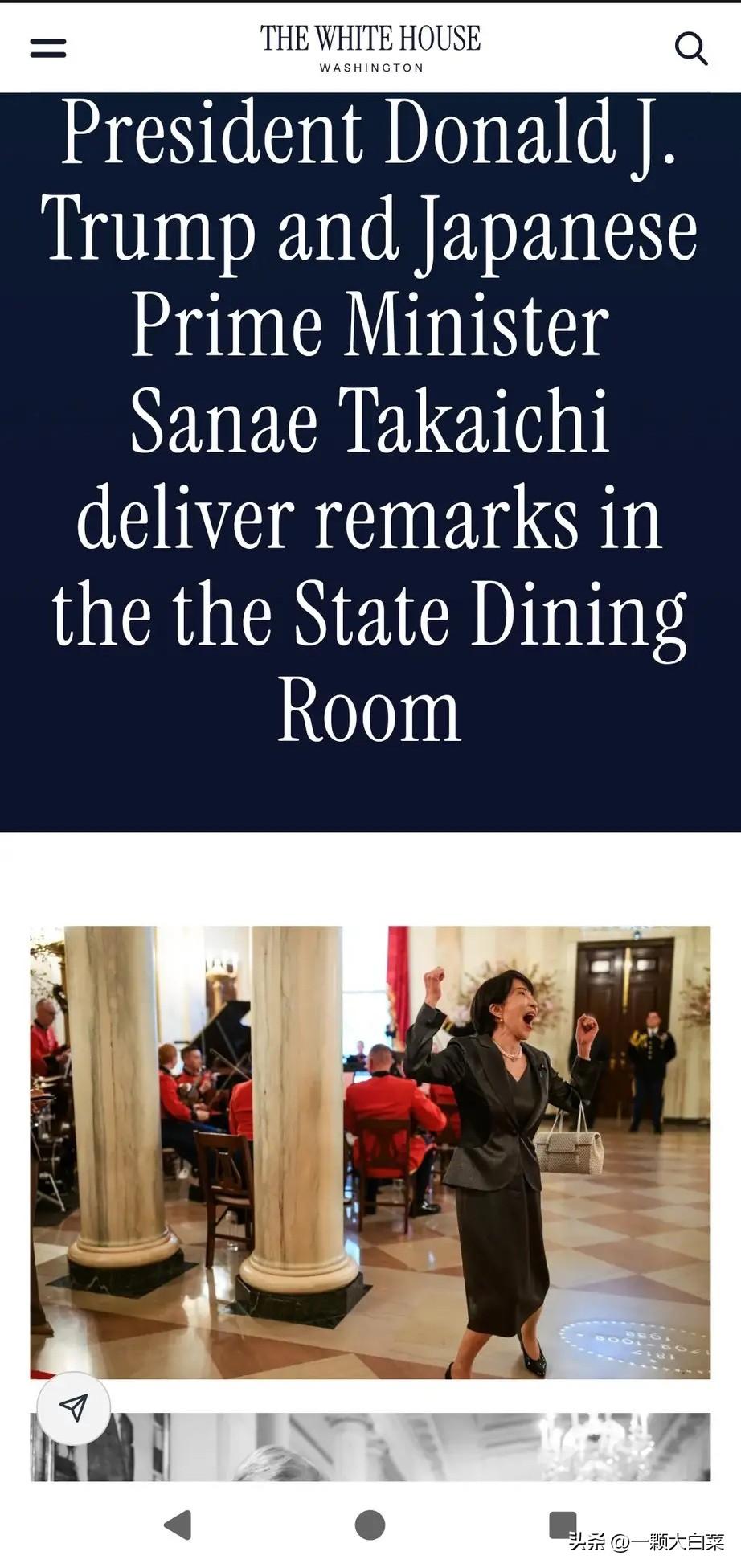 【美国人为高市早苗选定的国宴封面照】白宫网站,展示特朗普为款待高市而举办的国宴系列照片,封面照竟然是这一张(图一),已通过白宫官方画廊向全球公布。 有成千上万张照片,偏偏选这张,老美你们是几个意思?她到底是首相,还是啦啦队队长! 白宫摄影师按下快门前,脑子里早就盘算好了。他们不是随便抓拍,每一张官方照片都有政治语言,这张封面照更是精心设计的视觉宣言。看看高市早苗那表情,高举右拳、身体扭动、笑容狂喜,活脱脱一个追星现场。特朗普团队太懂怎么拿捏人了,他们知道高市是重金属乐迷,特意选了X Japan的《Rusty Nail》当背景音乐,就等着她“真情流露”。 这可不是简单的失态问题。外交场合的每一帧画面都是国家形象的投射,白宫偏偏挑了最不庄重的一张当门面,意思再明白不过:在我这儿,你就是个需要讨欢心的客人。对比一下三天前她在日本国会的模样,面色苍白、站都站不稳,被议员追问是否按美国要求出兵霍尔木兹海峡。短短72小时,跨个太平洋就“满血复活”,在摇滚乐里扭得忘乎所以。 日本网友炸锅不是没道理。“高市马鹿”成了网络热词,二战时陆军海军互骂“马鹿”,现在全民吐槽自家首相。更扎心的是,有人质问:首相跳舞时有没有想起美以袭击中死去的165个伊朗儿童?国家领导人在施害者宫殿里狂欢,这种画面传递的价值观让人脊背发凉。 再看看其他细节,味道就更不对了。访问阿灵顿国家公墓时,高市穿的是两三厘米的圆头平底鞋,美国礼宾官员踩的是尖头高跟皮靴。一个无声无息,一个步步带风。鞋子比西装更会说话,这无声的较量比任何外交声明都真实。平底鞋代表服从,高跟鞋宣示主导,美日关系谁在上谁在下,一目了然。 高市这次访美带了730亿美元投资大礼,分给核反应堆和天然气项目。特朗普用一首歌、几句客套话,就换来了真金白银。更讽刺的是,这场访问连份联合声明都没有,美国拿了实惠,却不愿做任何书面承诺。生意人出身的特朗普,把交易艺术玩到了外交场,用最小成本换最大满足感。 白宫选这张封面照,本质上是在定义这段关系的性质。它想告诉全世界:看,这就是日本首相在我们面前的样子。兴奋、讨好、甚至有点卑微。这不是偶然失误,而是有意为之的形象塑造。国宴封面照相当于国家名片的正面,美国选择了最能体现权力关系的那一张。 各位读者你们怎么看?欢迎在评论区讨论。