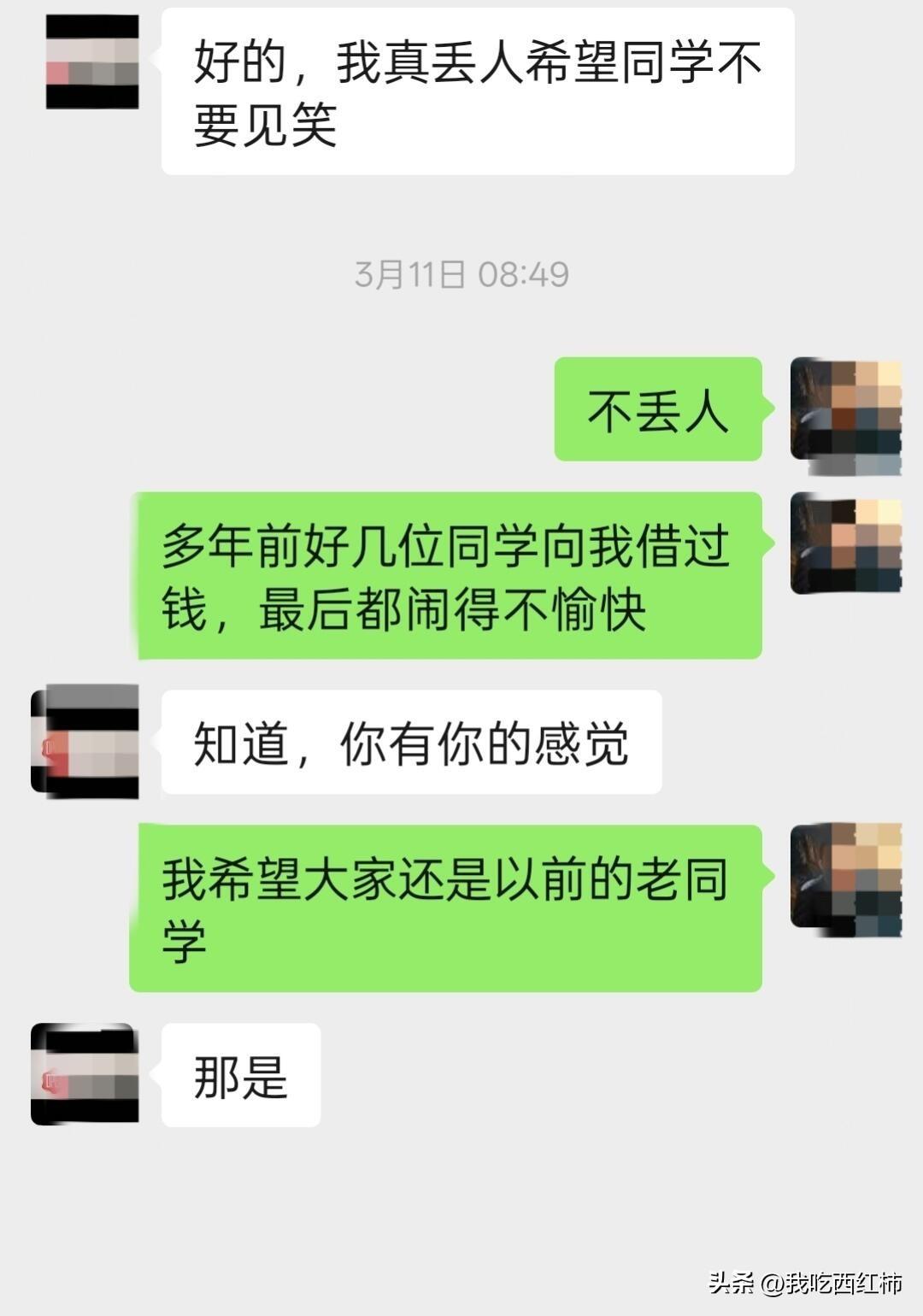 三十年前的老同学向我借钱被我拒绝了 三十年前的大学校友,昔日的同学兼老乡,都在校友群里,也互加了微信,却从不联系,也极少关注彼此的朋友圈。前几日,她突然发来消息问候近况,说自己投了三百万的生意亏了,随后话锋一转,说急需用钱,想请老同学帮忙,借一万或五千块,最多一个月就还。 我曾在十几年前“帮过”几位大学同学,最后都不欢而散,有的甚至被删了微信,从此再无交集。这次再遇老同学开口借钱,我果断拒绝了。如今这个社会,借钱往往不只是有去无回,更像是给自己多添了一个“仇人”。大家觉得我做得对吗?