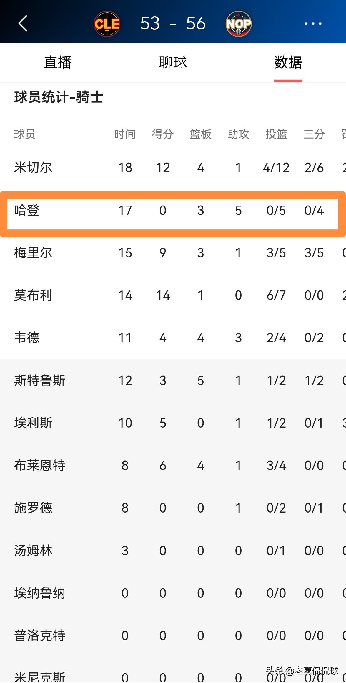 骑士超级巨星哈登真是让人大吃一惊!在今天骑士客场挑战鹈鹕的比赛中,目前双方半场战罢,骑士以53:56落后于对手。让人感到非常吃惊的是,在前两节比赛中,哈登竟然怒砍0分,他在首发出战的17分钟里,投篮5中0,其中三分球4中0没有得分入账,不过有3篮板5助攻1抢断,他的场上正负值为+1。 坦白说,当我看到哈登在上半场比赛中怒砍0分时,我真是大吃一惊,这样的哈登真是太罕见了。