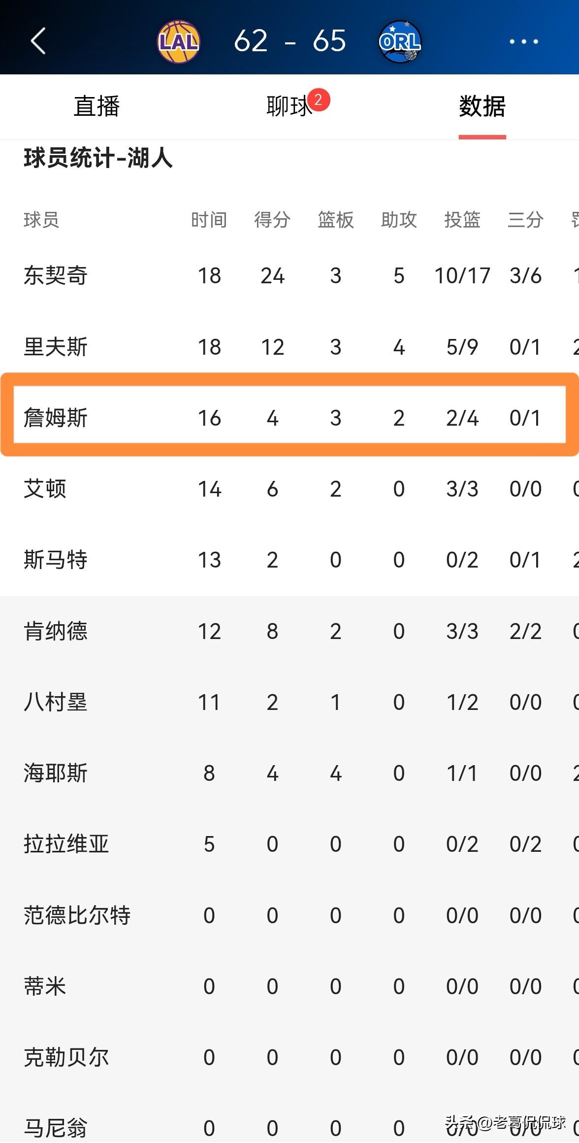 湖人超级巨星詹姆斯真是太平淡了!在今天湖人客场挑战魔术的比赛中,目前双方的上半场比赛已经结束,湖人以62:65落后对手3分。值得一提的是,在前两节比赛中,詹姆斯的表现非常的平淡,他在首发出战的16分钟里,投篮4中2,其中三分球1中0仅仅得到4分3篮板2助攻,他的场上正负值为-8。 老实说,以詹姆斯在上半场比赛中的表现来看,他是湖人三巨头中表现最平淡的球员,詹姆斯的得分欲望看起来并不强烈。