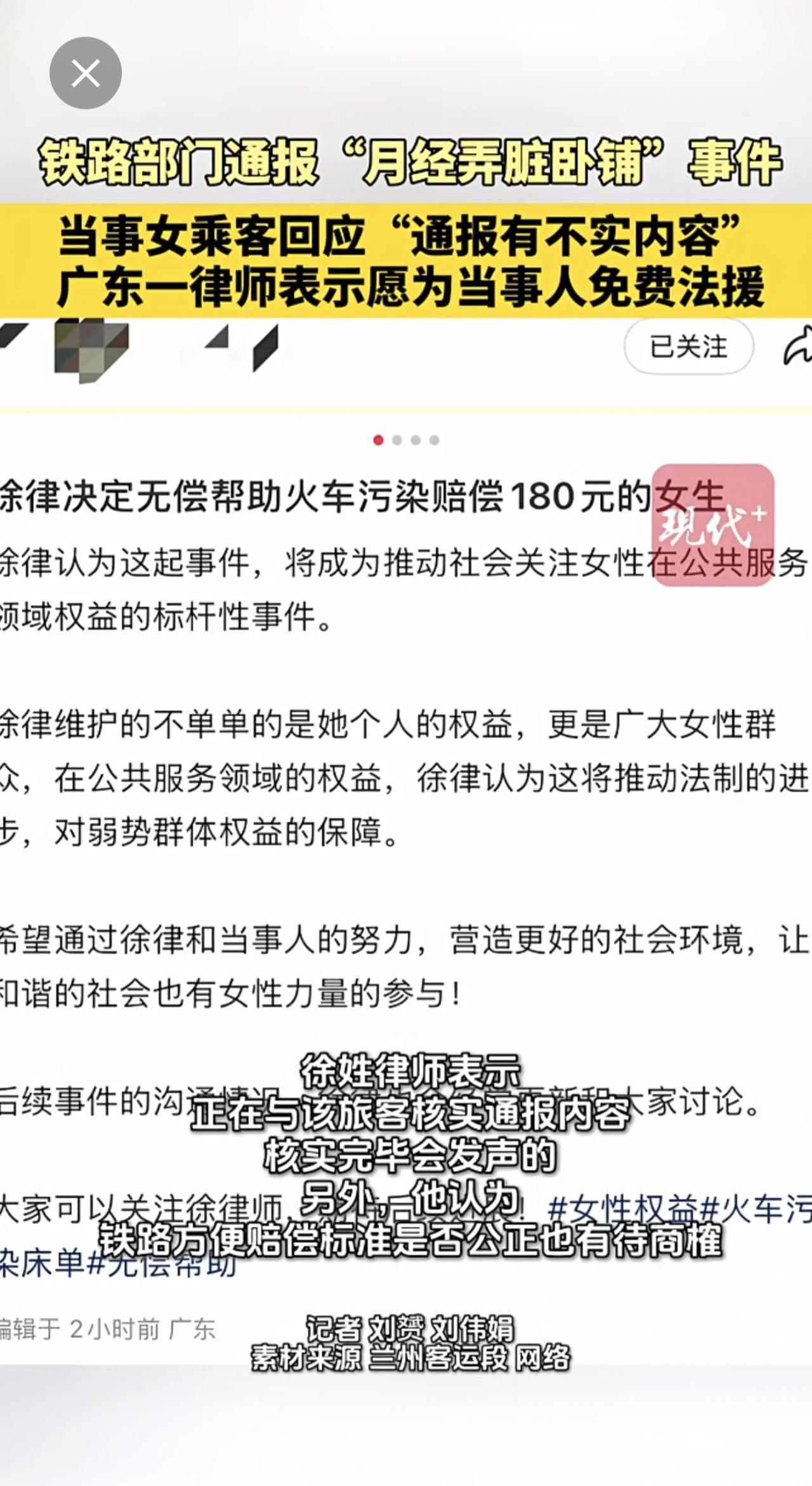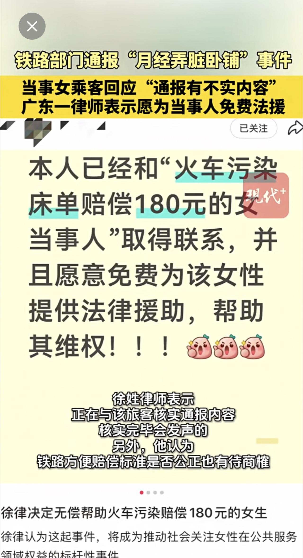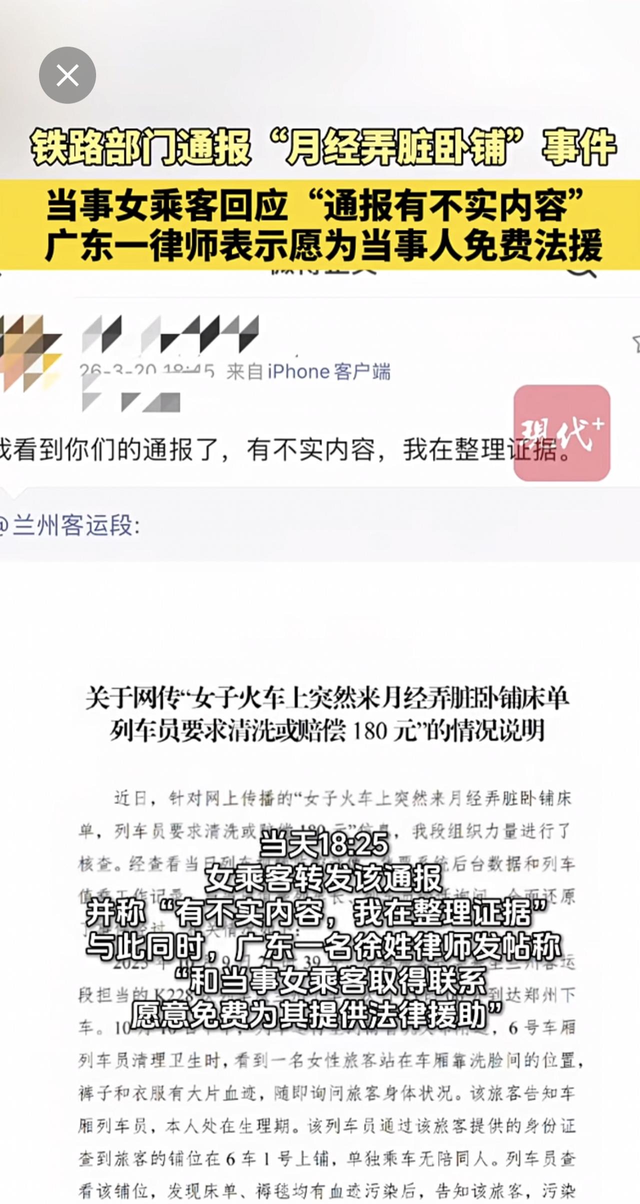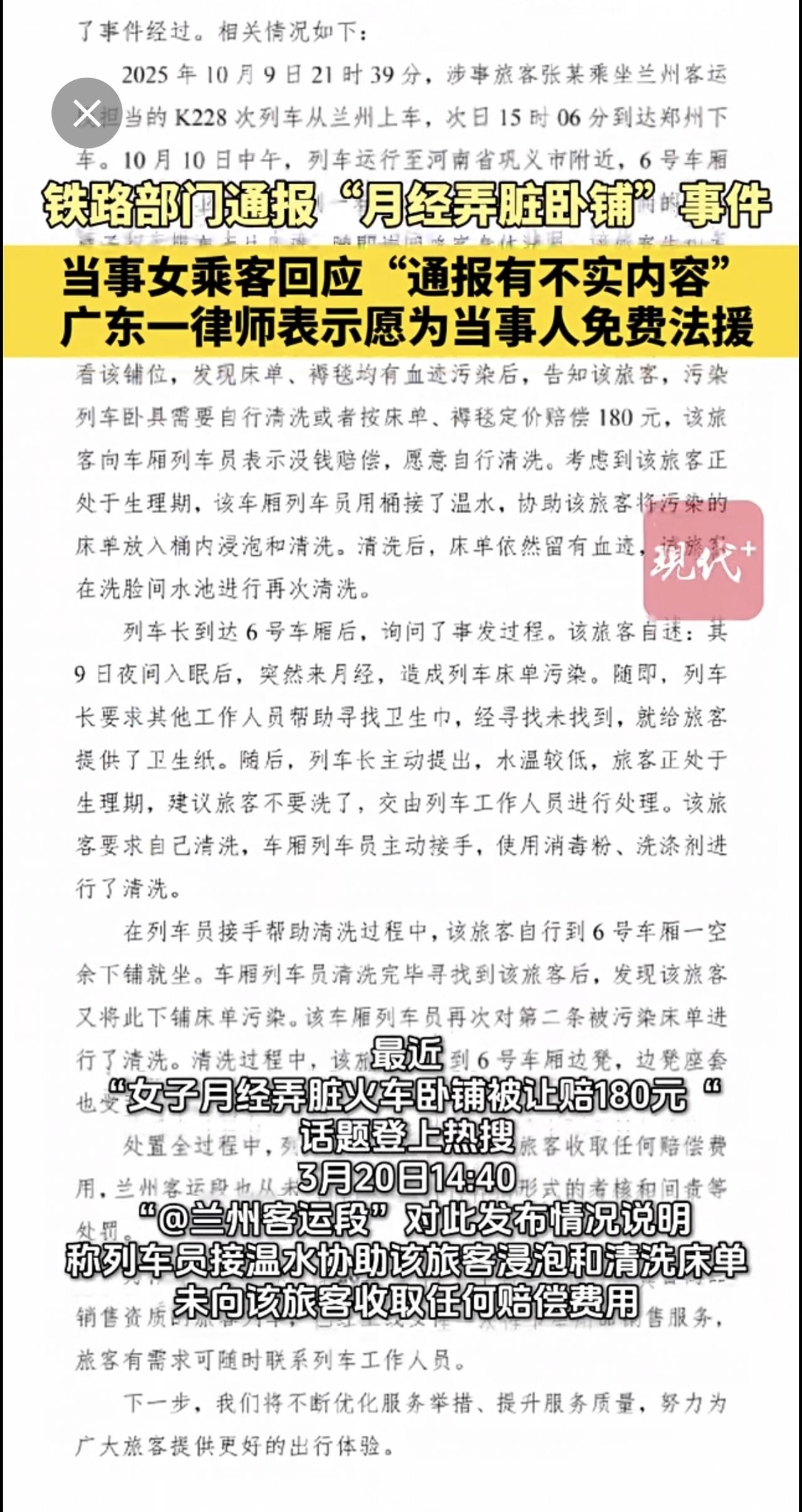 月经弄脏卧铺女子回应铁路通报。