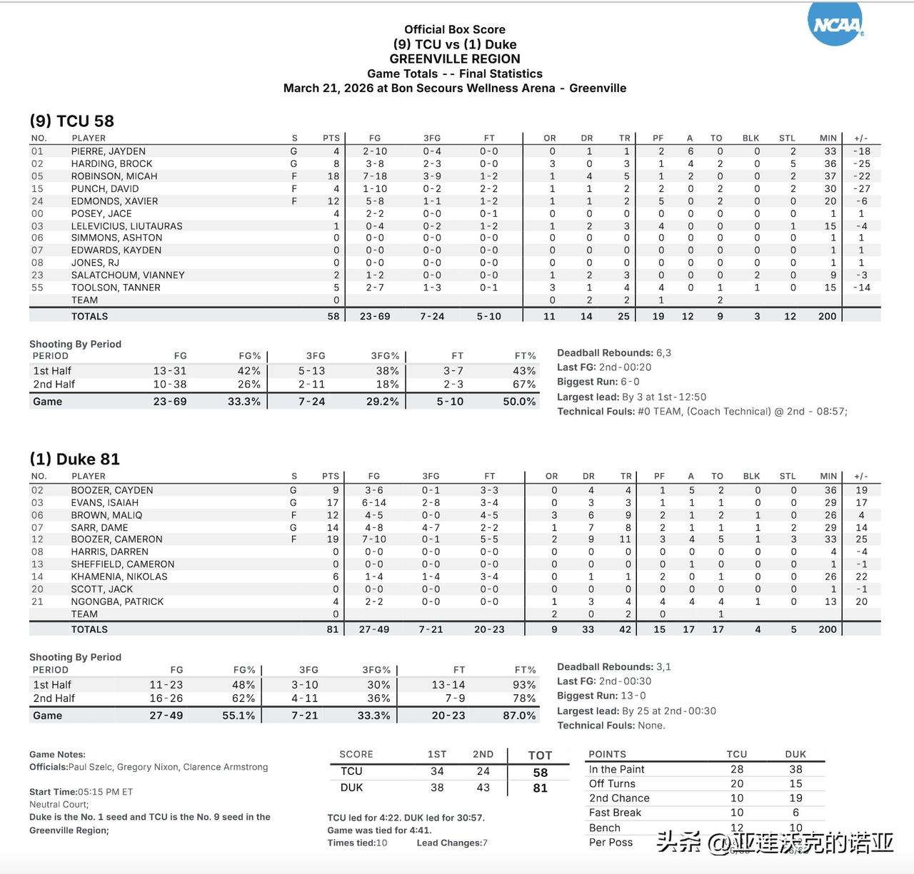 杜克击败TCU晋级甜蜜16强,中锋Patrick Ngongba复出,主帅Jon Scheyer称他是第一个骑着滑板车进入球场的球员,结果正负值+20,2026年nba选秀 Cameron Boozer表示无论我是第1还是第15顺位被选中,更重要的是球队是否适合我,对我来说,关键在于日复一日地积累,成为最好的自己。