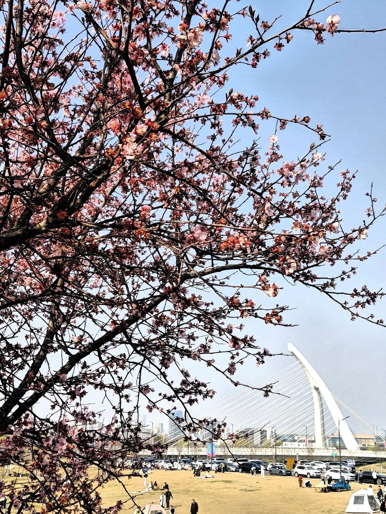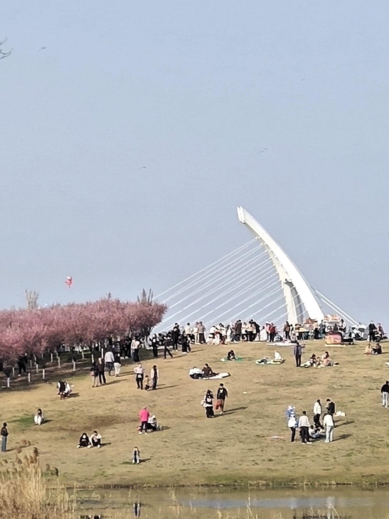 今年,南京江北新区美人梅花海美出了圈,看到网上的视频,就一直想过去看看,无奈前段时间天气一直阴雨绵绵,好不容易昨天出了个大太阳,又是周末,就去凑个热闹。然后到那边一看,哇塞,好多花,好多人。 有了美人梅这个混血娃,梅花家族就不再是香自苦寒来,临寒独自开的孤单,完全可以俏也可争春,在春天里插一脚了。 美人梅可真美,花朵重瓣,花色粉红,花量多,成片开放似红霞漫天。 导航南京江北新区公共工程建设中心,看到那座竖琴桥就对了,这里有美人梅花海,还有免费停车场。 收藏好明年再来吧,因为现在花已经开始谢了。