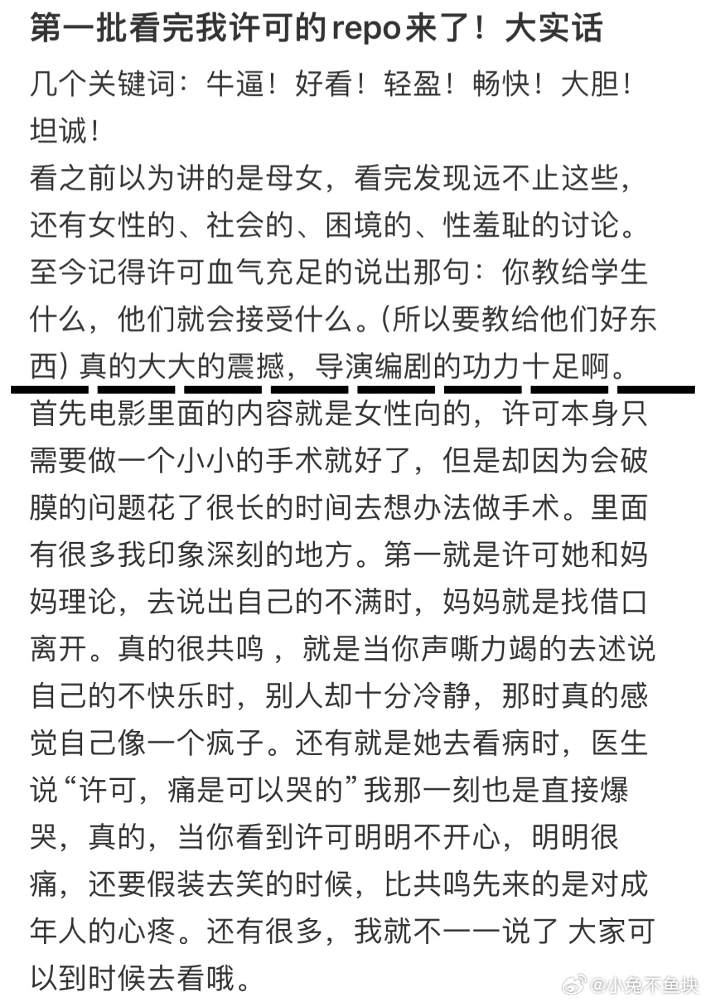 文淇我许可点映口碑文淇新片点映口碑 看完《我,许可》点映真的被治愈到了,没有华丽的特效,没有刻意的煽情,每一句台词、每一个镜头都很有力量,温柔又戳心,看完满是共鸣,这个春天最值得看的治愈片,23城点映可冲!
