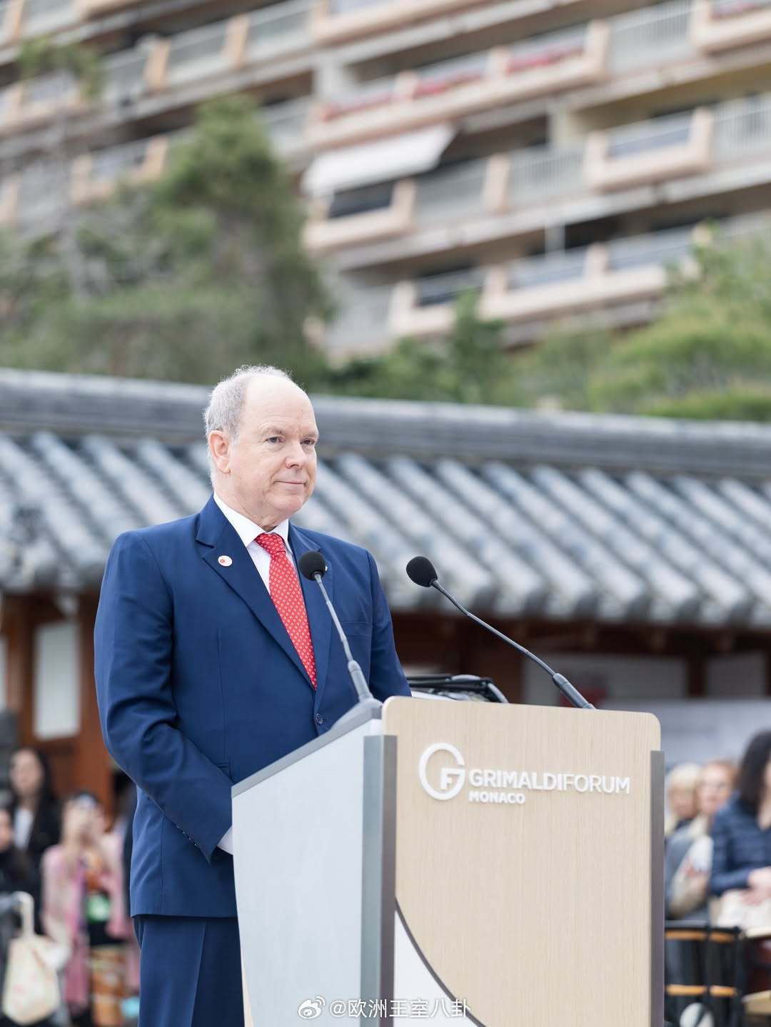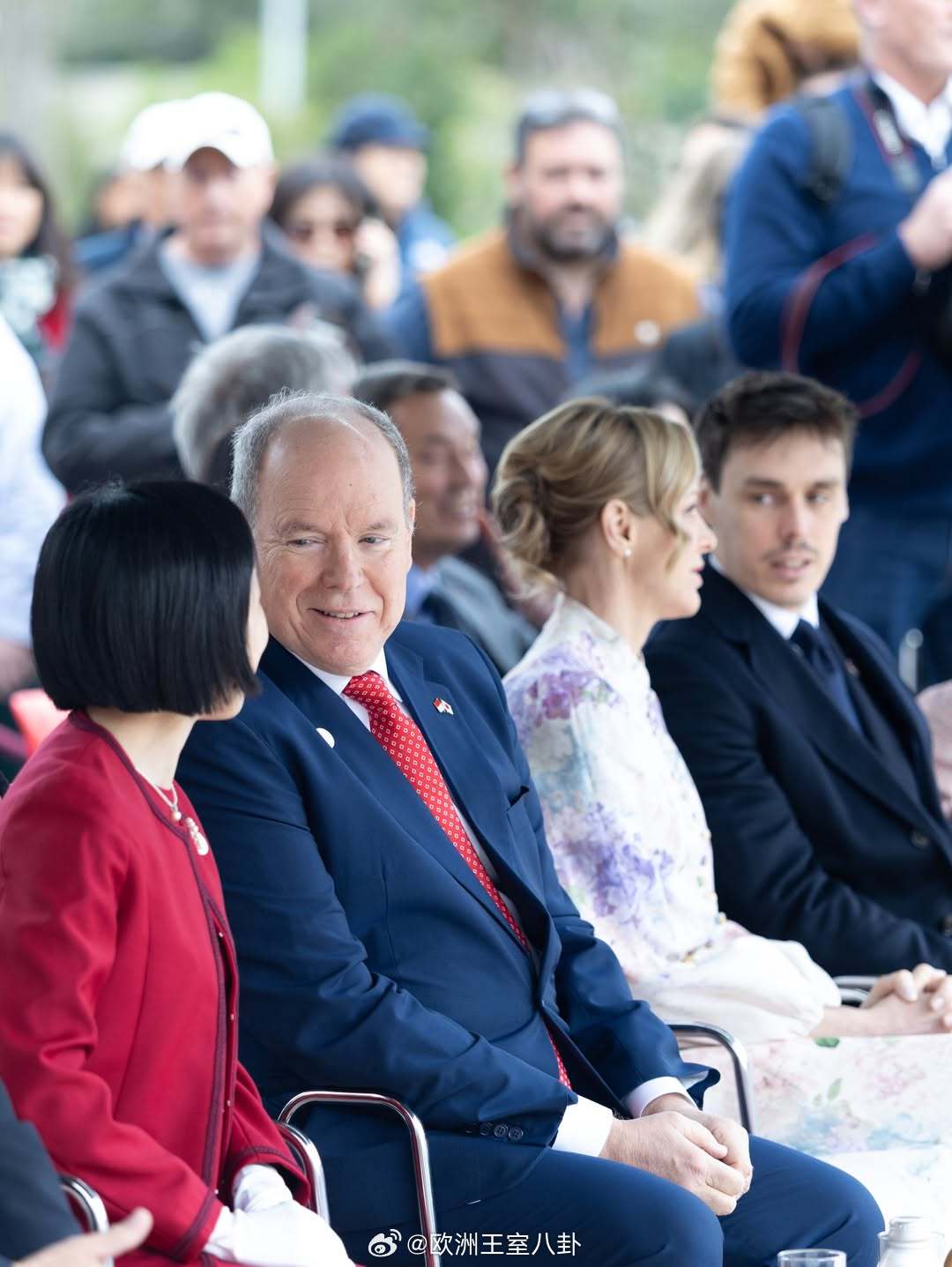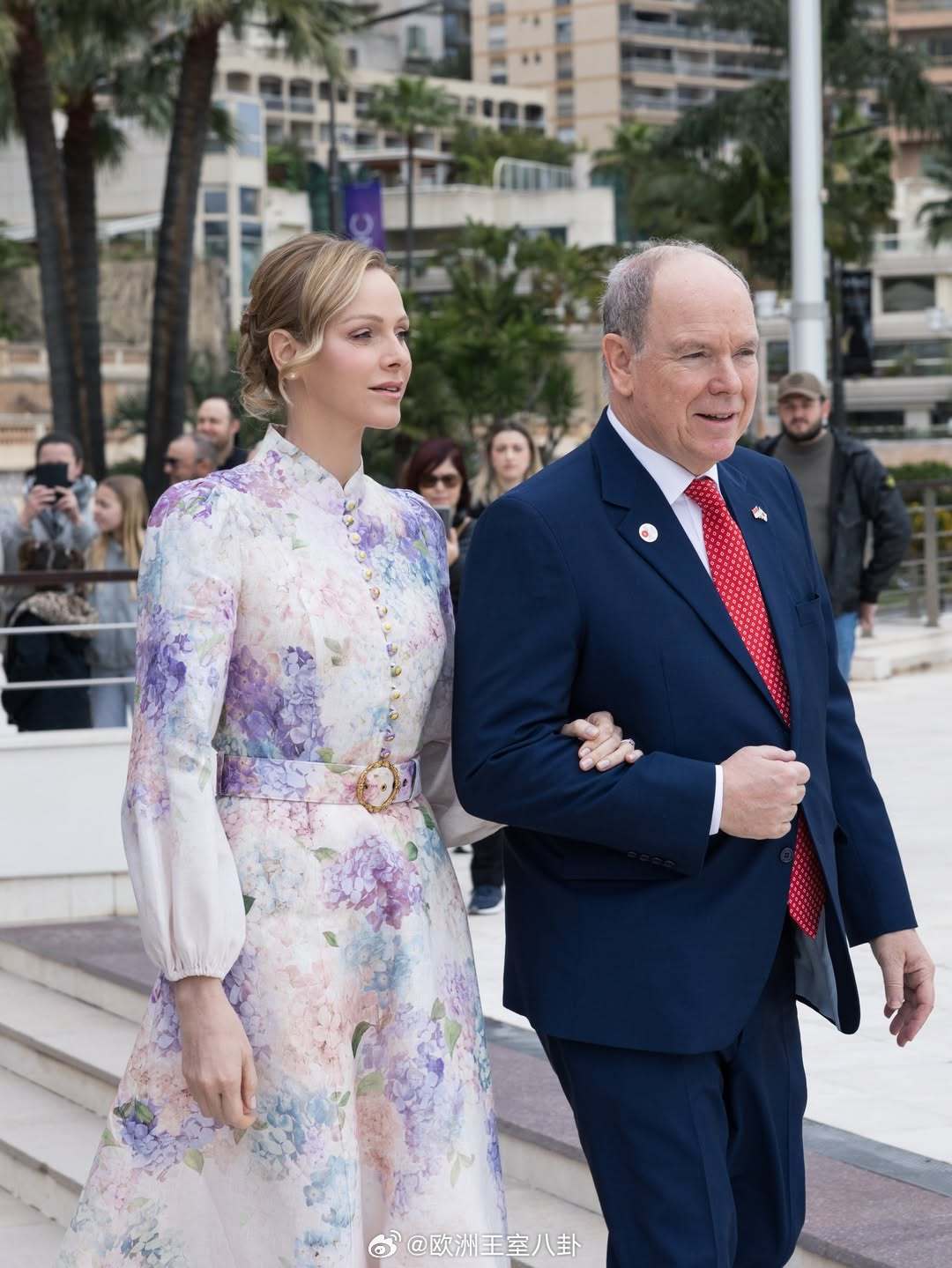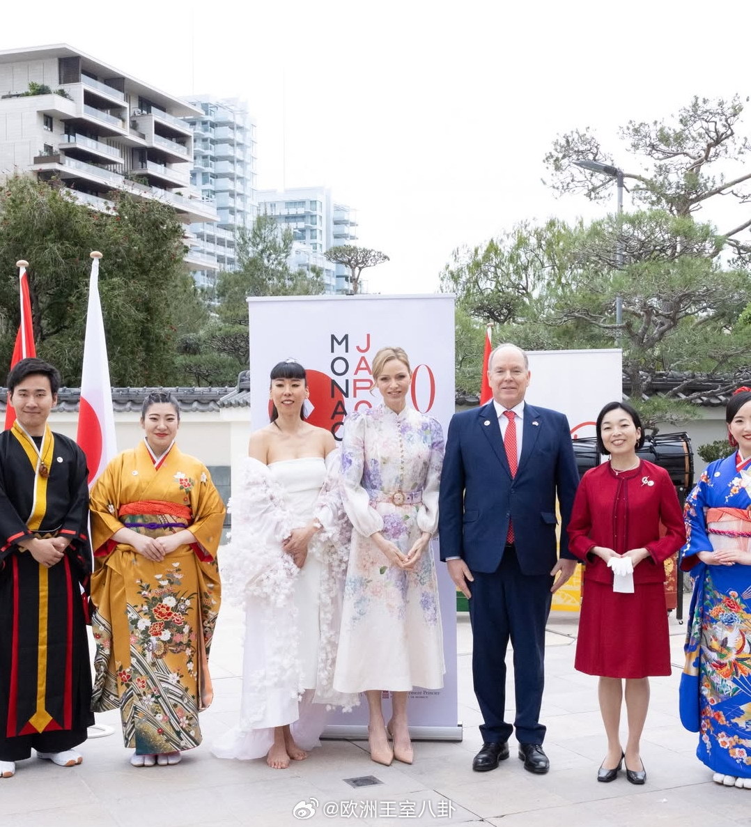 3.21 摩纳哥亲王阿尔贝二世和王妃夏琳出席与日本建交20周年的庆祝活动,三笠宫彬子还在,背景可见斯蒂芬妮的儿子路易斯夏琳花裙来自zimmermann