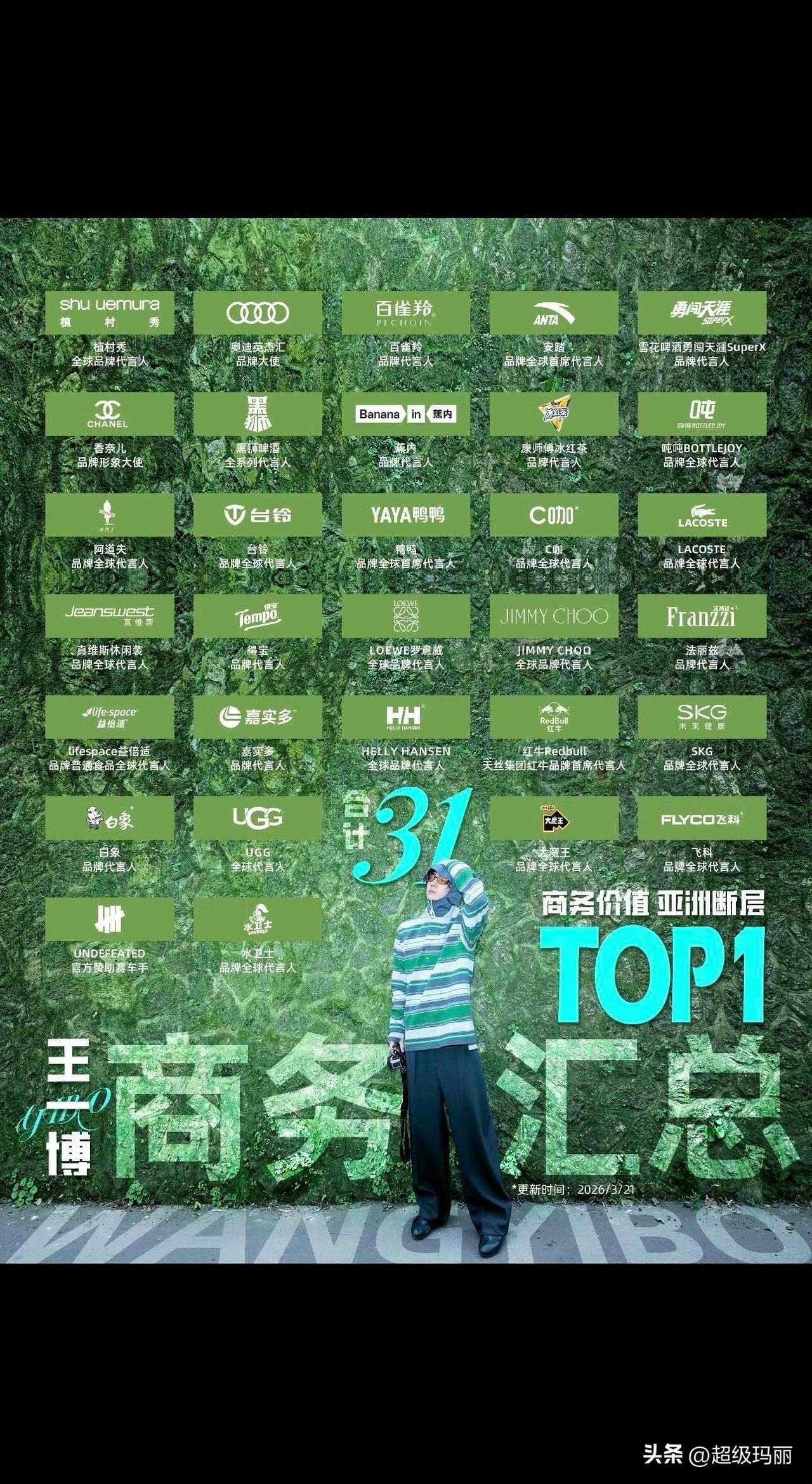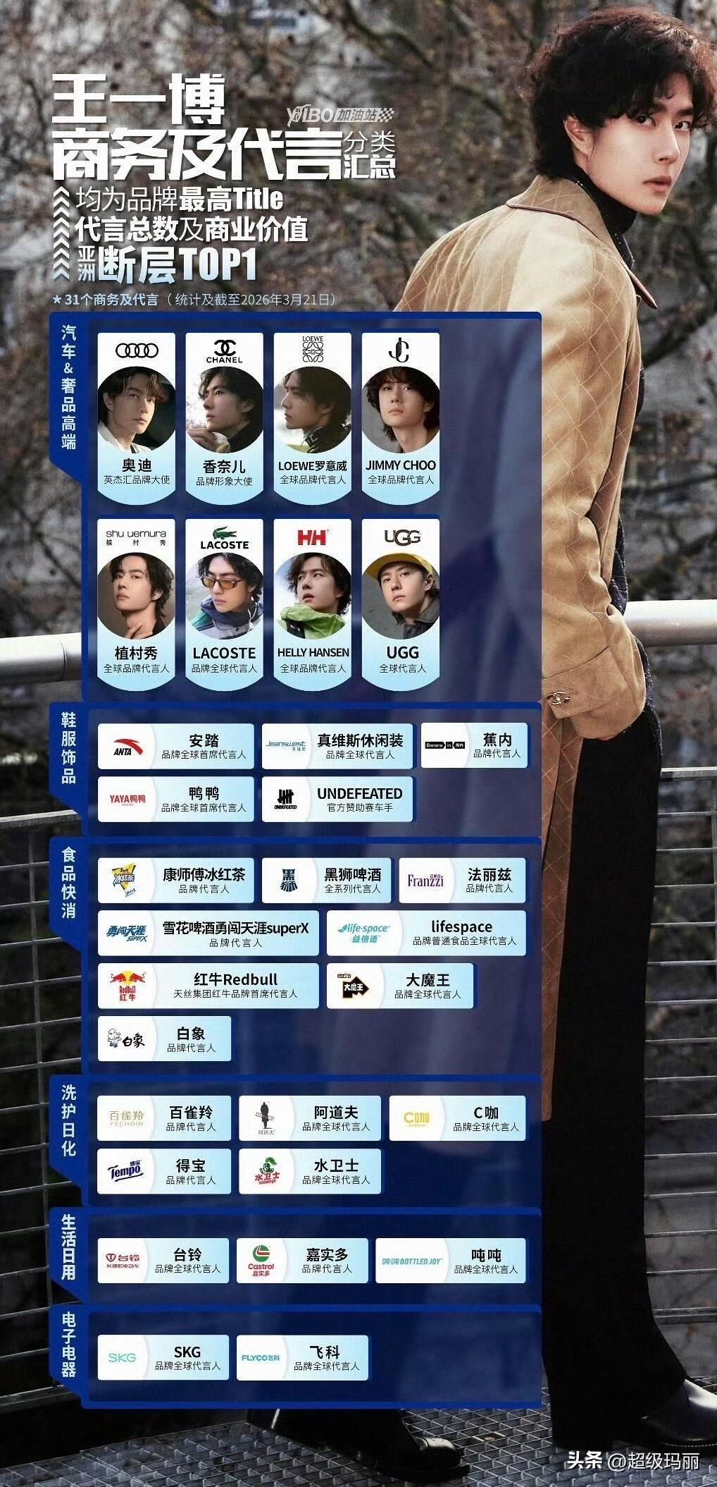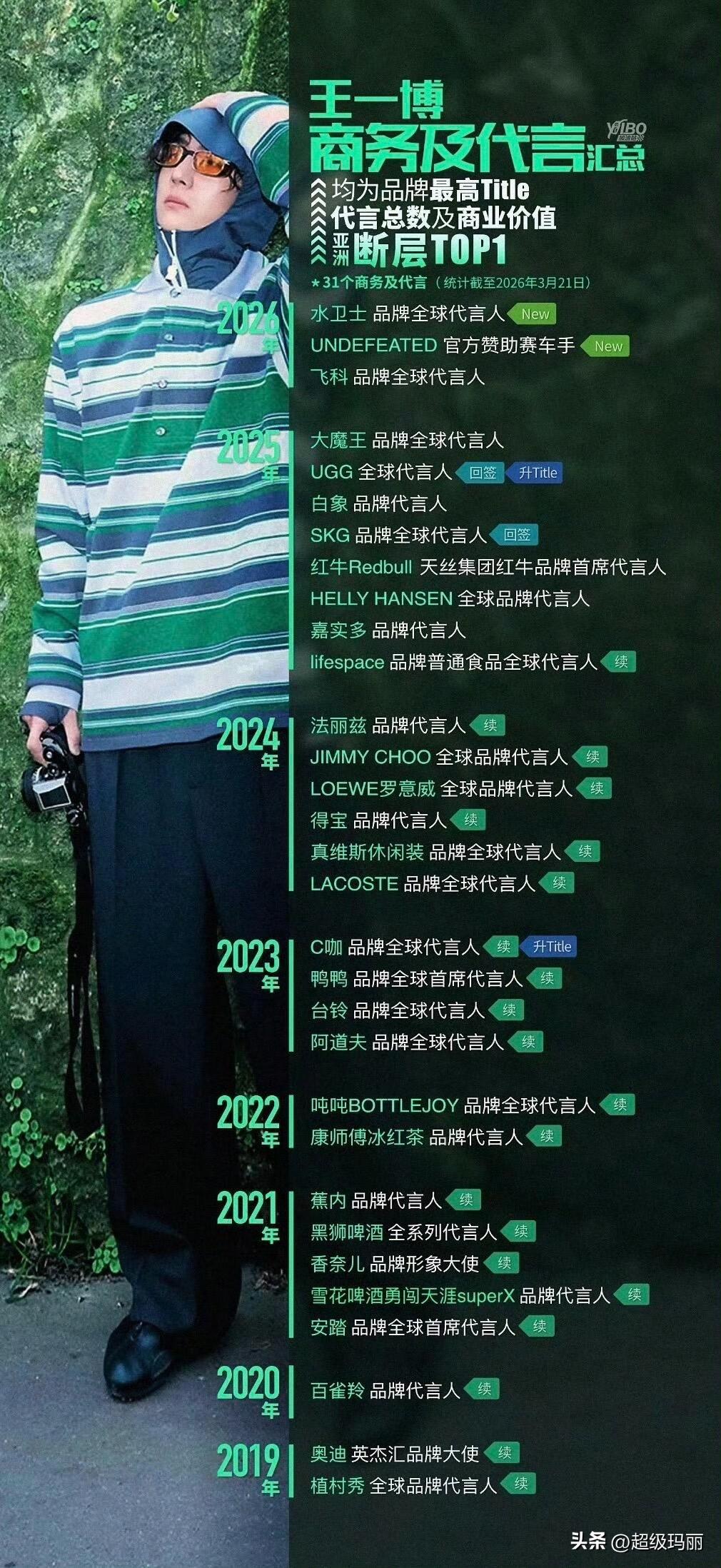 3个全球首席代、16个全球代、9个品牌代、2个大使,均为最高title王一博 商业价值连续7年保持绝对TOP1🔝这一核心数据与地位体现品牌对其商业价值的高度认可。自2019年起,奥迪、植村秀等品牌持续合作超7年;安踏、香奈儿等合作超6年,2026年新增水卫士(全球代言人)、UNDEFEATED(官方赞助赛车手),同时多个品牌完成续约或头衔升级(如UGG升为全球代言人、C咖升Title),展现持续增长的商业号召力和释放强劲的个人IP商业势能🐮