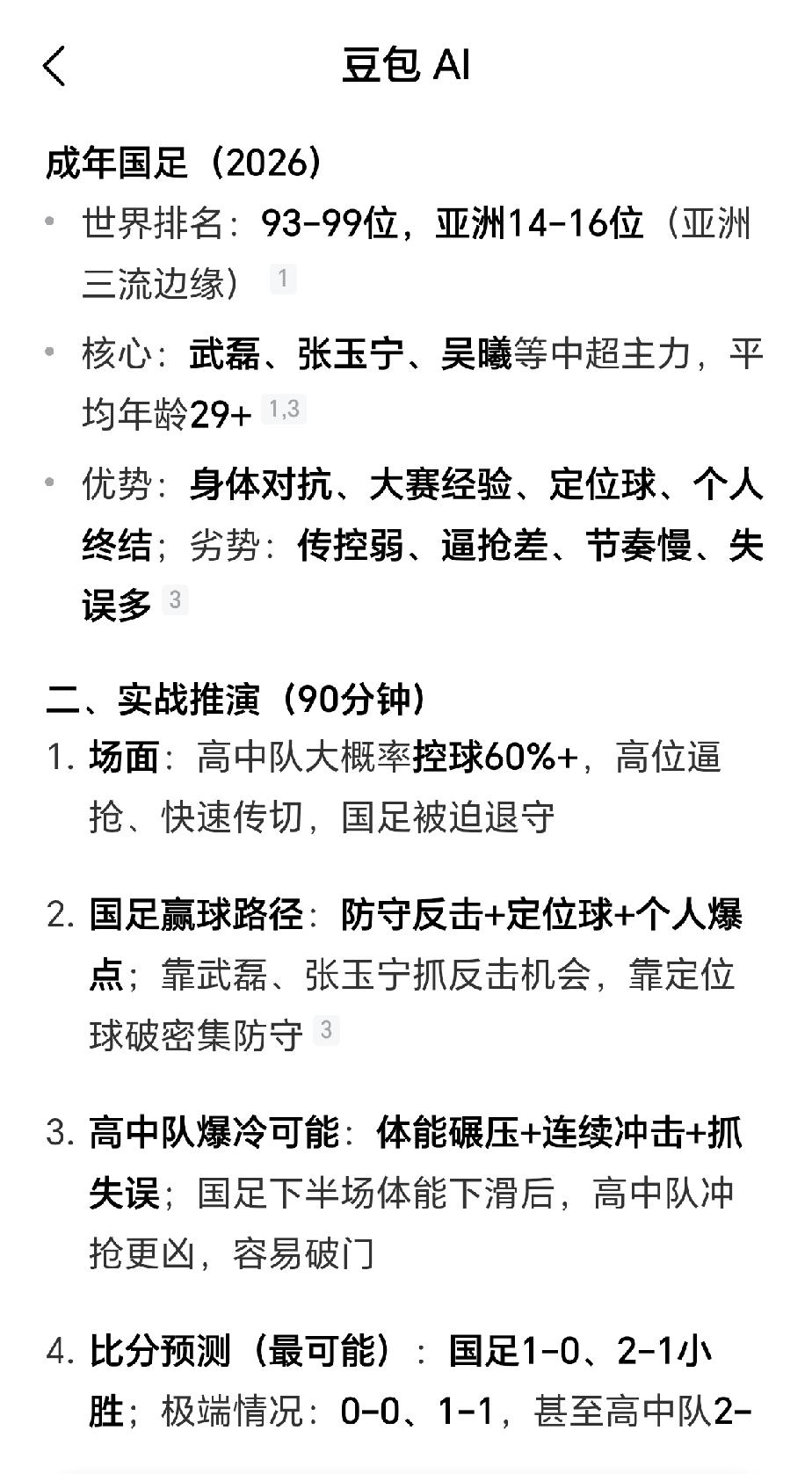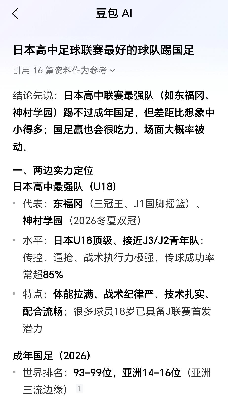 我的天爷啊!这是真的吗?我向豆包提问,我们的国足和日本高中生联赛最好的球队踢,能不能稳赢? 这样竟然都不能稳赢?真是全面落后人家太多了吧?根据预测咱们也就是1:0小胜,并且还有很大概率输给对方。人家豆包还给出了例子,比如我们u18输给人家高中生球队,还不是最强的高中生球队。 我们的u23输给人家的u21,而且高中生最强球队和日本u21差距很小,这是说明我们真有可能踢不过人家的高中生! 大家觉得国足能赢日本高中生球队吗?