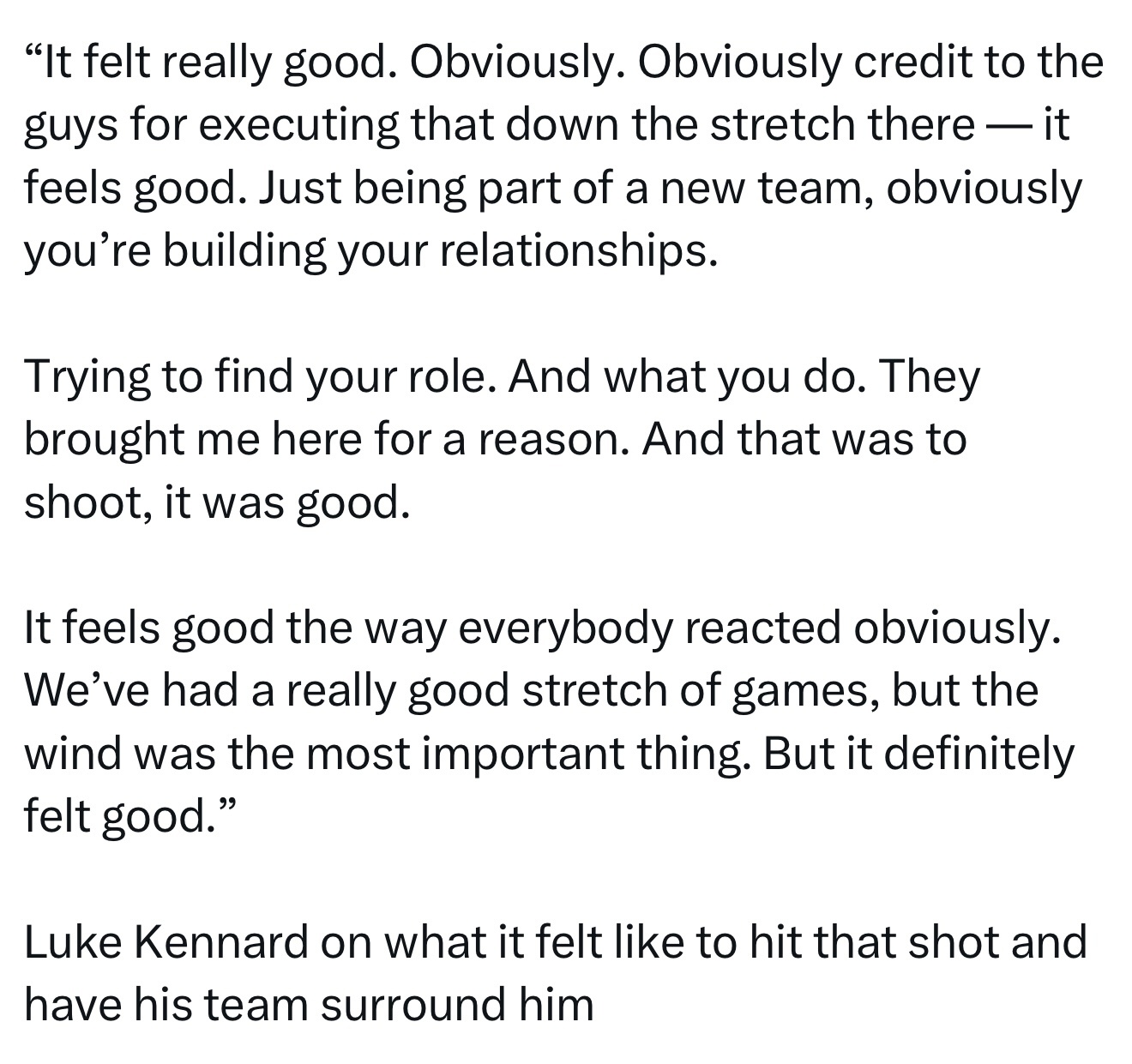 肯纳德谈绝杀后被队友包围的感受:“这感觉真的太棒了。显然,这要归功于队友们在最后时刻完美执行了战术——这种感受很美妙。作为一名新加入球队的成员,你正在逐步建立与大家的默契,寻找自己的定位,明确该做什么。球队引进我自然有原因,而我的任务就是投篮——今晚做到了。