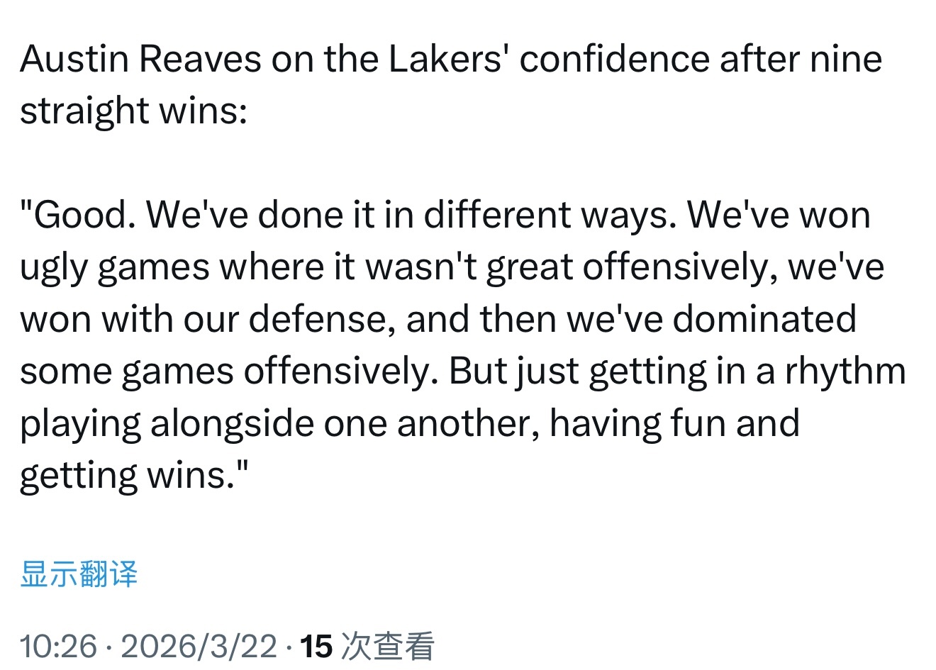 里夫斯谈湖人9连胜后的信心:“很好。我们用不同的方式赢过球。我们赢过一些进攻并不出色的丑陋比赛,也赢过凭借防守取胜的比赛,当然也赢过一些进攻端占据绝对优势的比赛。但最重要的是找到彼此配合的节奏,享受比赛,并最终赢得胜利。”湖人vs魔术