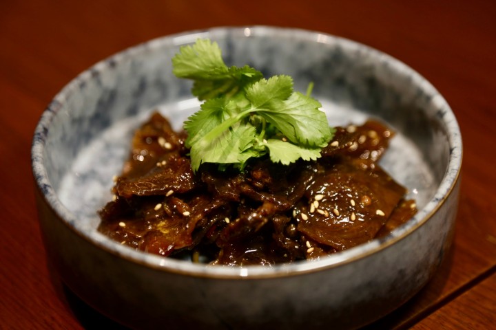 上来的第一盘小菜就把我“辣住了”,盐边牛肉看着“无害”,却让人一震。等辣意渐渐消散,回味时只觉牛肉吃来薄而嫩,我还可以再来一片。