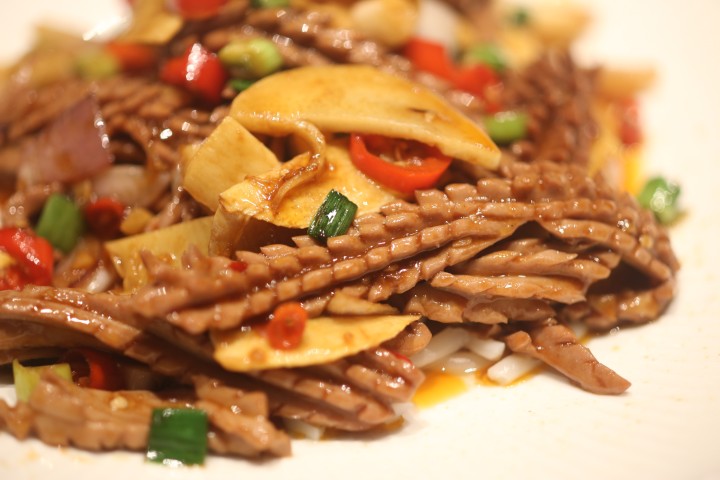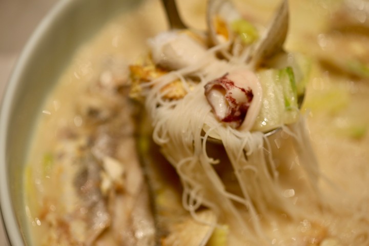 品尝过家烧海鲜的清淡,我们迎来第二重口味稍重一些的菜品,其中爆炒腰花特别赞,切成长穗花状,丝毫没有异味,爆炒的火候拿捏得刚刚好,口感介于炝腰花与普通炒腰花之间。配料包括但不限于笋片、大葱、辣椒,这些起到提味与增色的作用,还有垫底的米线,早已吸足了汤汁。