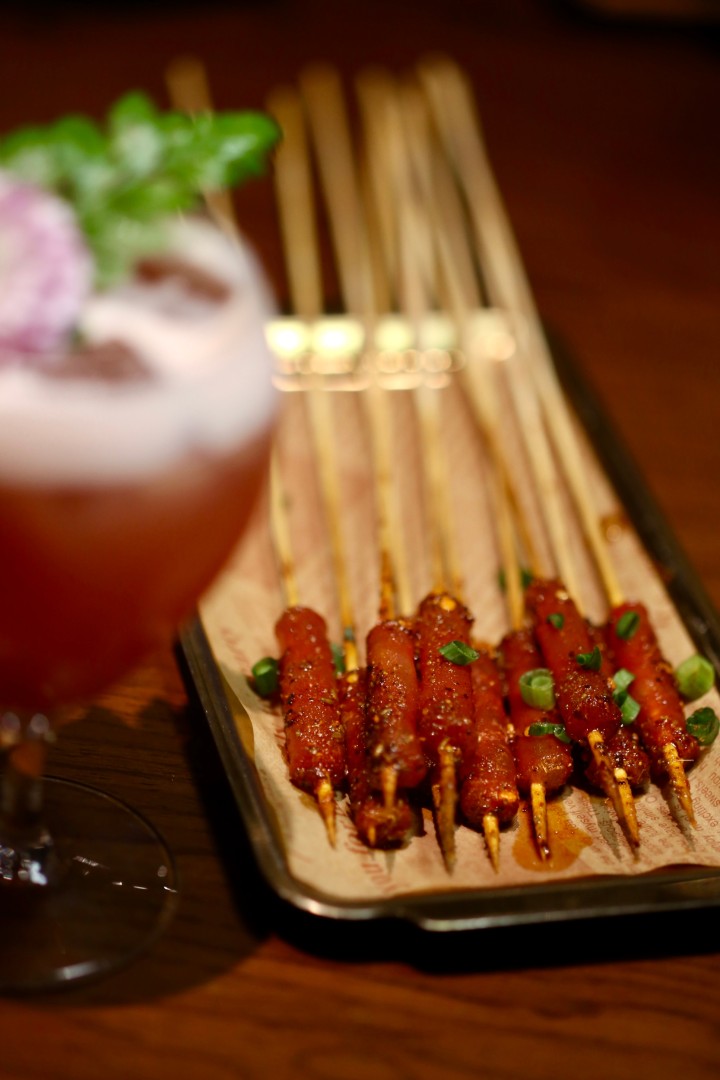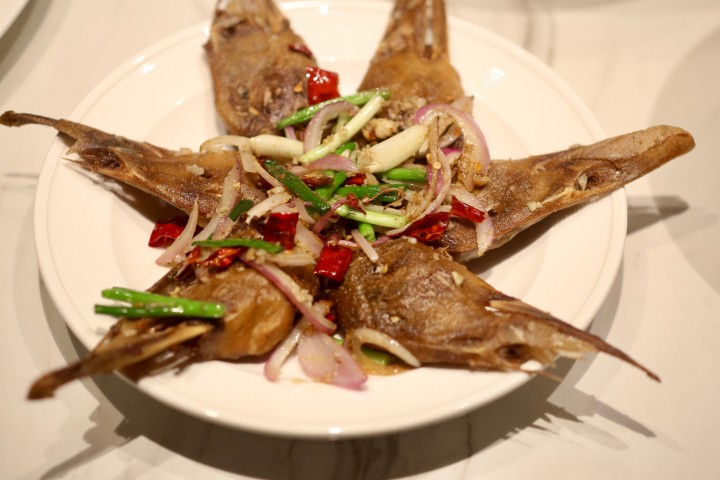 好吃的台州菜吃了,好看的饮料喝了,老板娘说还有!那就是第三重,下酒菜了,先上来的是炸得薄薄脆脆的鸭头,撒上调料,油润不腻,果然很下酒。