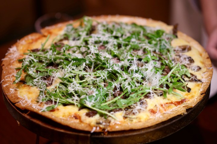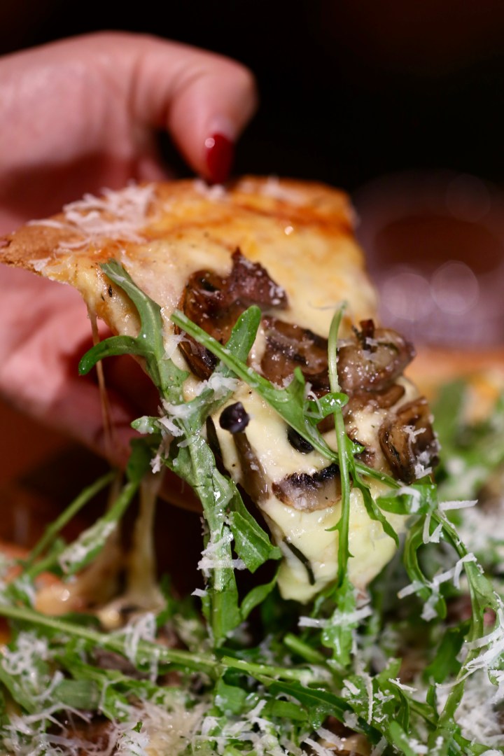 幸好下一个登场的是墨西哥风味脆饼,一度以为是披萨呢,长得真像。薄薄的面饼带着焦香的脆意,黑松露、蘑菇、我热爱的芝麻菜,混合着芝士,极好地安抚了空腹吃辣的不安,为后面的辣菜做好准备。
