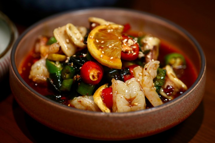 酸辣小海鲜有几分泰式风,酒馆里昏黄的灯光下,红绿双色的辣椒与鲜黄的柠檬,视觉上的冲击先到,紧接着味觉上的享受也有了。