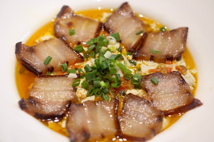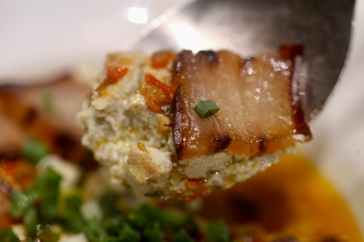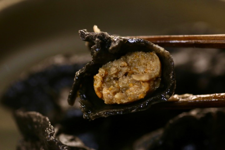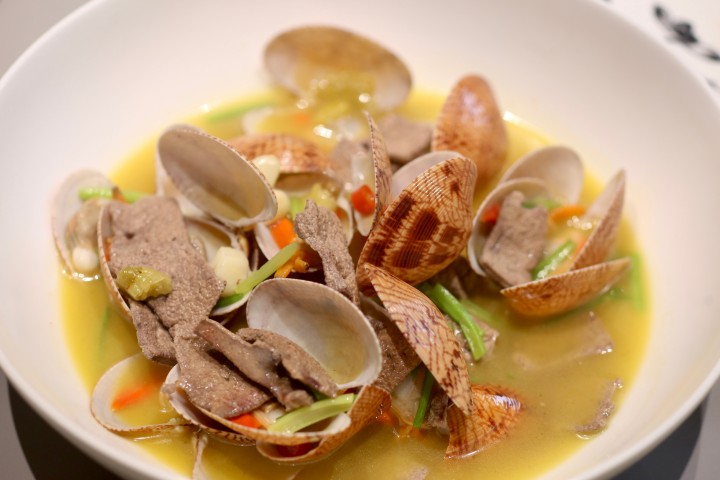 如果说雪菜冬笋白虾是对传统家常菜的演绎,那么芒果贝半汤滑猪肝就是一次出乎意料的创新。第一次吃到这样的食材组合,火候掌握得恰到好处,大家都嫩嫩的,精彩之处在于猪肝吸收了些许贝类的海洋味道。别问张诚怎么会想到把这两个炒一起的,问就是“有天晚上朋友来店里喝酒,其他食材都卖光了,就剩下这两样,凑合着炒一炒”。