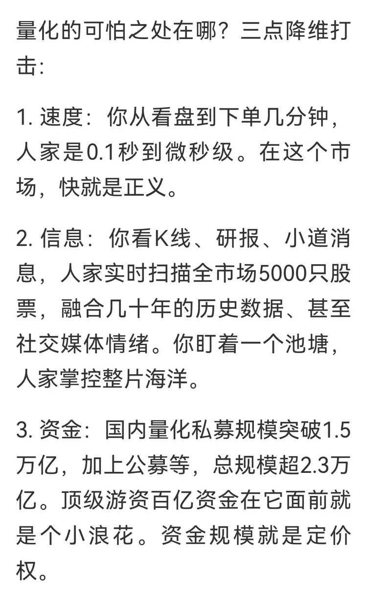股友说,梁文峰的量化交易,在A股市场上搞得腥风血雨。 可他为什么只敢在A股玩,不敢去港股,美股,搞量化呢。 归根到底还是怕被罚。 因为量化对于市场交易来说,就是最大的老千。 在欧美,他会被罚得倾家荡产,一点生存空间都没有!