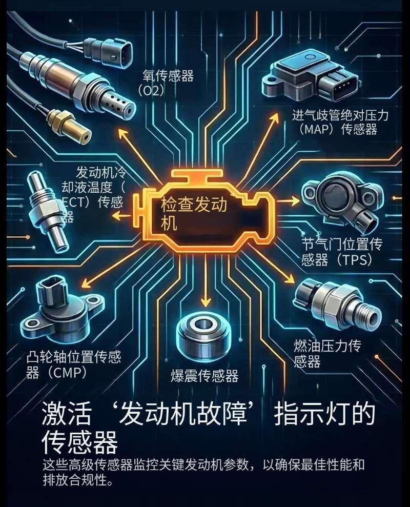 发动机故障灯(CHECK ENGINE)为什么会亮? 收藏这张速查清单,让你一眼看清问题出在哪👇 仪表盘上亮起“故障灯”,最常见的原因就藏在这些传感器里: - 氧传感器(Lambda传感器) - 进气压力/流量传感器(MAP/MAF) - 爆震传感器 - 以及其他一些部件 觉得有用?点个关注,这里全是汽车干货!🚗💨 汽车故障点 故障灯故障 车辆故障灯解读 汽车胎压故障灯 汽车打火故障 大众车故障码 领克故障灯