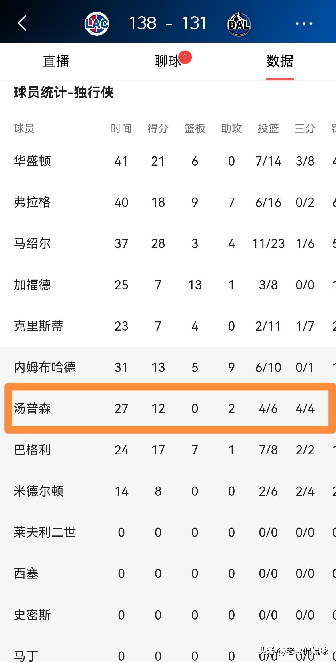 独行侠老将克莱-汤普森真是虽败犹荣!虽然今天独行侠在主场以131:138不敌快船,但是老将汤普森的表现却非常的精彩,尤其是在三分线外的表现,汤普森更是百发百中。 全场比赛下来,汤普森替补出战27分钟,投篮6中4,其中三分球4中4非常高效的得到12分,还有2助攻,他的场上正负值为+14。 坦白说,以汤普森在本场比赛中的表现来看,他属于典型的虽败犹荣,毕竟对于一名36岁的老将来说,能够打出如此出色的表现实属不易。