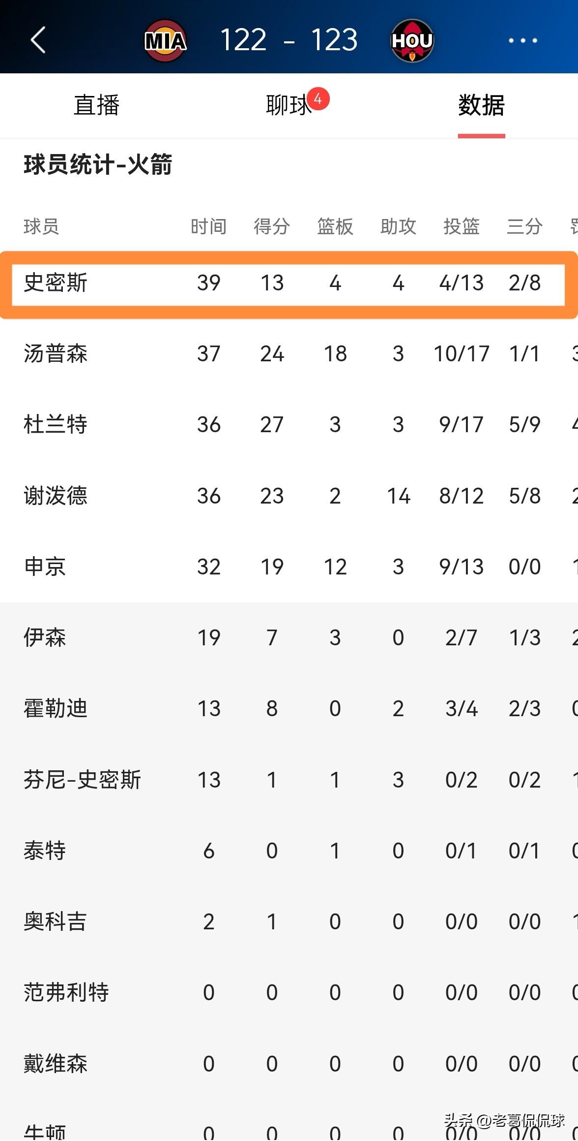 火箭大将小史密斯终于低迷了!虽然今天火箭在主场以123:122击败热火,但是小史密斯打出了最近一段时期最低迷的一场比赛。 整场比赛下来,小史密斯首发出战39分钟,投篮13中4,其中三分球8中2、罚球4中3非常低效的得到13分,他的场上正负值为-4。 坦白说,本场比赛如果不是小史密斯遭遇低迷,火箭绝对不会被热火拖到比赛的最后时刻。