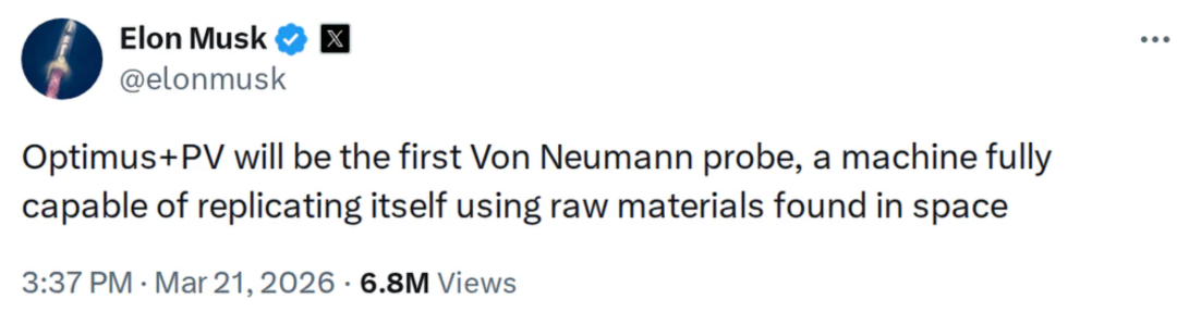 特斯拉CEO埃隆·马斯克在社交平台公开表示,Optimus+PV将成为首个冯诺依曼探测器。