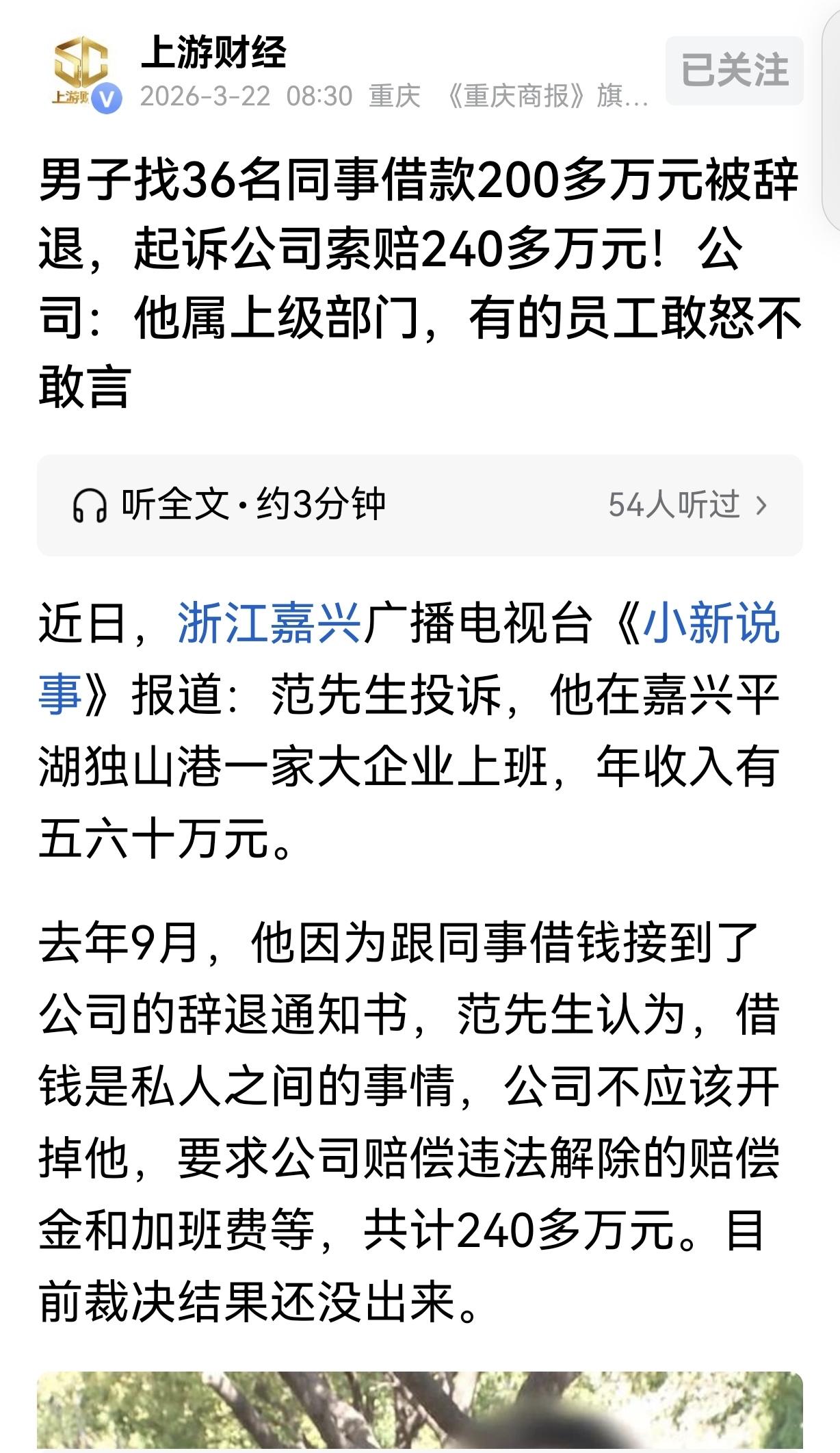 浙江嘉兴,一男子年薪60万,他仗着自己是公司部门经理的助理,是班子成员之一,跟36个同事借了200多万买彩票,借了不打欠条,同事没钱,他还教人家在手机上贷款再借给他。还有的借了还,还了再借。同事们敢怒不敢言,不借怕他给穿小鞋,公司忍无可忍,直接把男子开除了,男子竟然起诉公司索赔240多万元!公司爆出另一个开除男子的理由,让人直呼他活该。 范先生本来每年拿着60万左右的年薪,可以说收入已经远超普通人。 他在当地一家大企业当部门经理助理,属于部门班子成员,前途本来一片光明,小日子过的也衣食无忧,有滋有味,结果,他把一手好牌打得稀巴烂。 据范先生说,前几年,大学同学游说他,说他进行了什么什么投资,贼拉挣钱,那钱哗啦啦的往他账户上跑。 范先生一下子动心了,他虽然每年不少挣,但跟人家财务自由的大学同学比,还是很汗颜。 人家挣钱跟捡钱似的,躺在床上就数钱,他得早九晚五,早出晚归,年薪手一松就花的溜干净。 思来想去,范先生虽然知道投资有风险,但舍不住孩子套不住狼,富贵险中求,他决定把手里的积蓄,交给同学投资。 没想到,对方资金链断了,钱打了水漂。一般人遇上这种事要么走法律途径维护权益,要么慢慢攒钱回血。 可范先生偏不走寻常路,把主意打到了身边同事身上。他利用自己的职位身份,开始在部门里挨个借钱,前前后后找了36个同事,总共借了200多万。 俗话说,亲兄弟还明算账呢,他借钱的时候,连欠条都不打,这如果他耍赖,同事们告状都无门。 遇上手头紧拿不出钱的同事,他还主动教别人怎么在手机上申请贷款,让人家把贷出来的钱借给他。 这真够没脸没皮的,同事们也抹不开面子拒绝,只能硬着头皮为他背债。 有的同事一开始借给他的钱,好不容易收回来,他转头又找理由接着借。 同事们个个敢怒不敢言,毕竟他是部门领导身边的人,谁也不敢得罪,怕之后被穿小鞋,只能无奈的一次次掏钱。 公司去年3月,就发现了他私下借钱的事,一调查才知道事情闹得这么大。 而公司一调查,他借的钱根本不是用来填投资的窟窿,全拿去买彩票了,想一夜暴富,钱也都有去无回。 更过分的是,调查过程中,公司还发现,他之前还偷偷登录同事的工作电脑,把公司的人员信息、业务资料,都发到了自己私人邮箱,已经涉嫌泄露公司机密。 这下公司彻底忍不了了,走了工会审批流程后,2025年9月,直接给范先生发了辞退通知。 结果,范先生反而觉得自己冤枉,认为借钱是私人之间的事,那是他和同事之间有交情,人家心甘情愿把钱借给他,虽然没打欠条,也是相互之间信任,关公司什么事? 再说了,公司管得太宽了,凭啥开除他?他又没耽误工作,也没违规,他直接申请了劳动仲裁,要求公司赔他违法解除赔偿金、加班费等加起来240多万。 直到公司把他借钱买彩票、泄露公司机密的事爆出来,大家才纷纷感叹他这纯属咎由自取。 现在仲裁结果还没出来,不过大多数人都觉得他这索赔的要求根本站不住脚。 这事儿也给所有职场人提了醒,利用职权欺压同事、触碰公司规章制度红线的行为,最后只会自食恶果。 法律规定,劳动者严重违反用人单位的规章制度,或者严重失职、营私舞弊,给用人单位造成重大损害的,用人单位可以解除劳动合同,无需支付赔偿金。 范先生利用职务胁迫同事借贷、偷偷盗取公司涉密资料,两项行为均严重违反公司规章制度,公司履行工会程序后将其辞退完全合法,他主张的240万赔偿大概率不会得到支持。 对此,你怎么看? 关注@运良说法 学法律知识不迷路