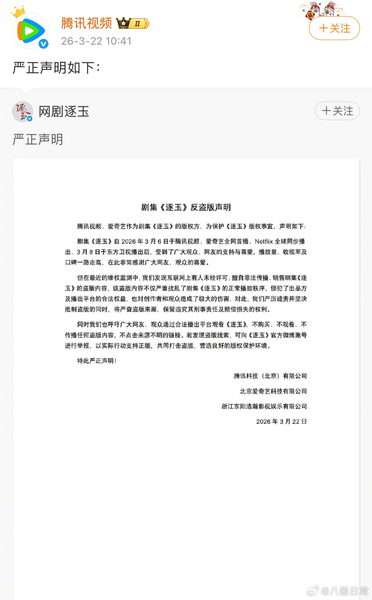 《逐玉》剧方联合版权方腾讯视频和爱奇艺发布反盗版声明