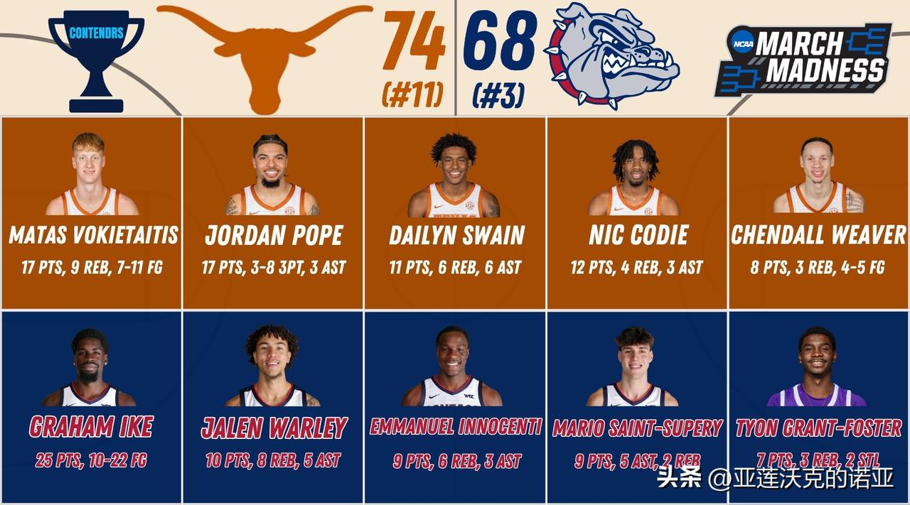 德州险胜冈萨加大学,长角牛是第六支从First Four闯入甜蜜16强的球队,普度转学生Cam Heide最后14秒投中关键三分球,立陶宛中锋Matas Vokietaitis单场17分9篮板,Jordan Pope得到17分,疯狂三月 斗牛犬主帅Mark Few连续两年第二轮被淘汰出局,之前曾连续9次晋级16强。
