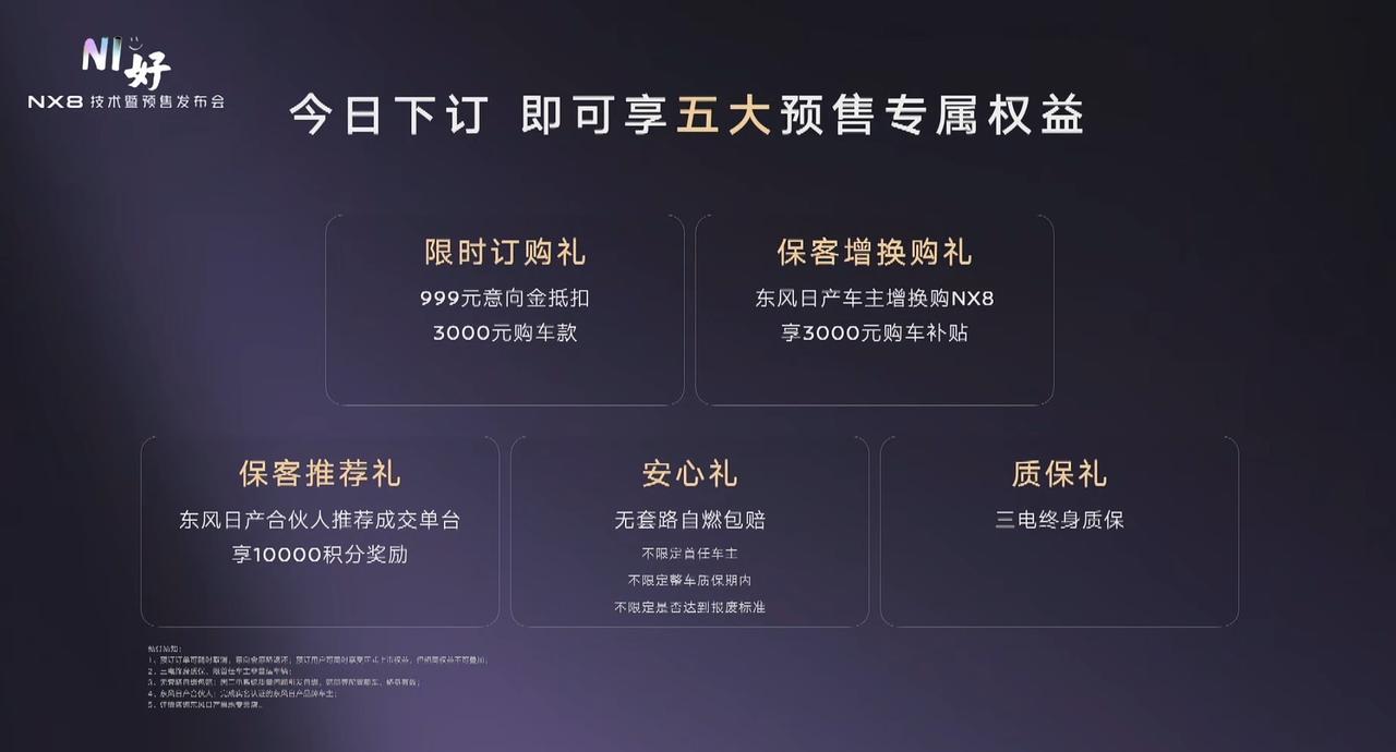 20万级市场新变量,NX8靠什么打? 东风日产NX8正式开启预售,目标直指20万级家用新能源SUV市场。在这个价位,消费者既要新势力的智能,又要合资的可靠,NX8试图给出一个最均衡的答案。 从硬实力拆解,NX8的竞争力体现在三个“不妥协”。第一,三电不妥协。纯电版搭载全新一代宁德时代磷酸铁锂电芯云盾电池,加上800V高压平台实现了5C超充,12分钟可完成10%-80%补能,CLTC续航650km,你就说夯不夯?增程版也采用了宁德大电池,光是纯电续航就有310km,综合续航1450km,亏电油耗仅4.52L/100km,数据均为同级领先。 第二,智能不妥协。Momenta智驾方案配合29个传感器(含激光雷达),实现全场景NOA;座舱内高通8295P芯片驱动双15.6英寸联屏与63英寸AR-HUD,AI语音助手支持方言识别与四音区交互,完全就是新势力的智能水平。 第三,舒适不妥协。AI舒享五件套将座椅、音响、空调、冰箱、彩电全面智能化,尤其是AI零压云毯座椅2.0,通过体态自适应算法实现“千人千座”的支撑体验。以前大家都说“冰箱彩电大沙发”,但以后可能就得说AI舒享五件套了。 当合资品质、顶级三电、领先智能、出色舒适在20万级的价位上同时出现,NX8无疑为该价格区间带来了新的价值参考标准。