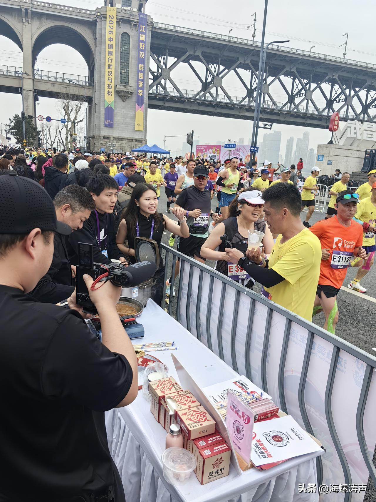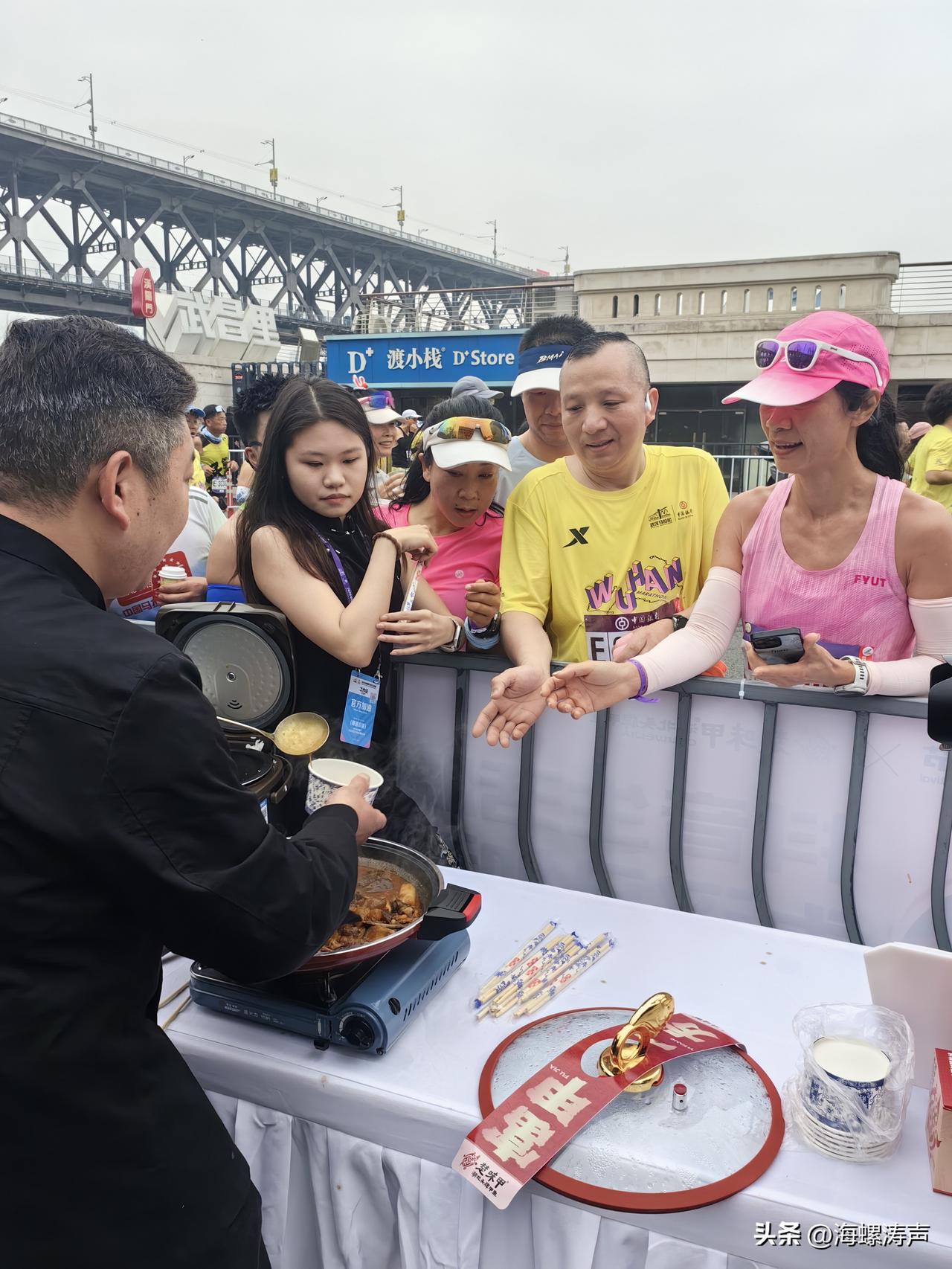 清晨八点左右,天色阴沉,雾气氤氲,但这丝毫阻挡不了市民们的脚步。临江大道上,助威呐喊声、秧歌锣鼓声、摊贩的吆喝声,交织成一首宏大的交响乐。我站在人群中,看着那些为了这一刻早早备货的商家,他们搬来了热气腾腾的热干面、清甜的绿豆汤、现炸的油条,甚至还有滋补的甲鱼汤。这些平日里最抚凡人心的武汉味道,此刻被免费递到了素不相识的跑者手中。这不仅仅是一碗面、一杯汤,这是武汉人“不服周”的豪爽,是刻在骨子里的热情与好客。