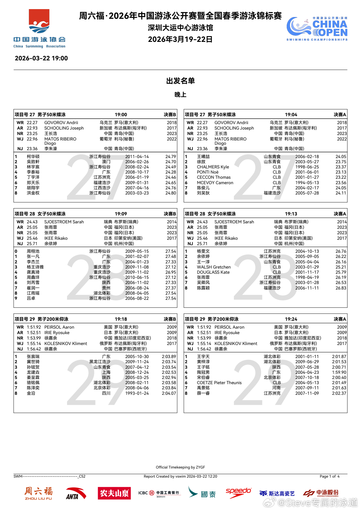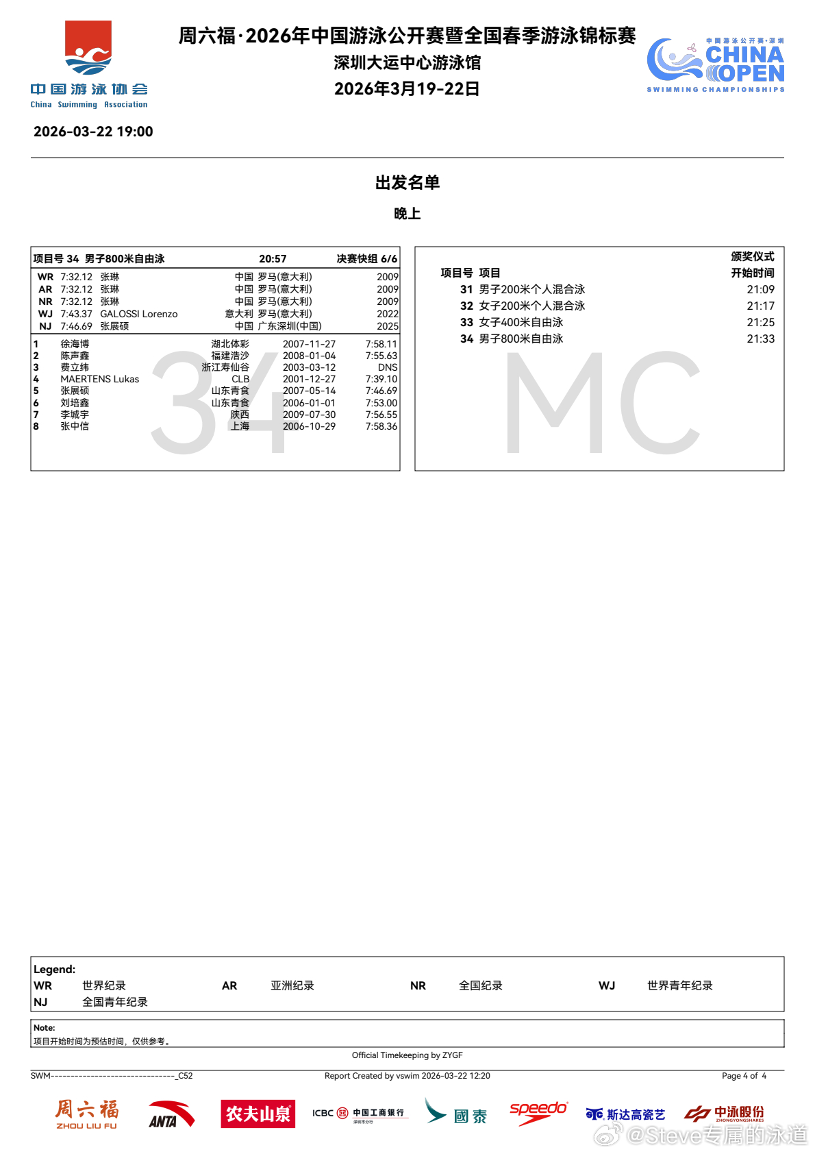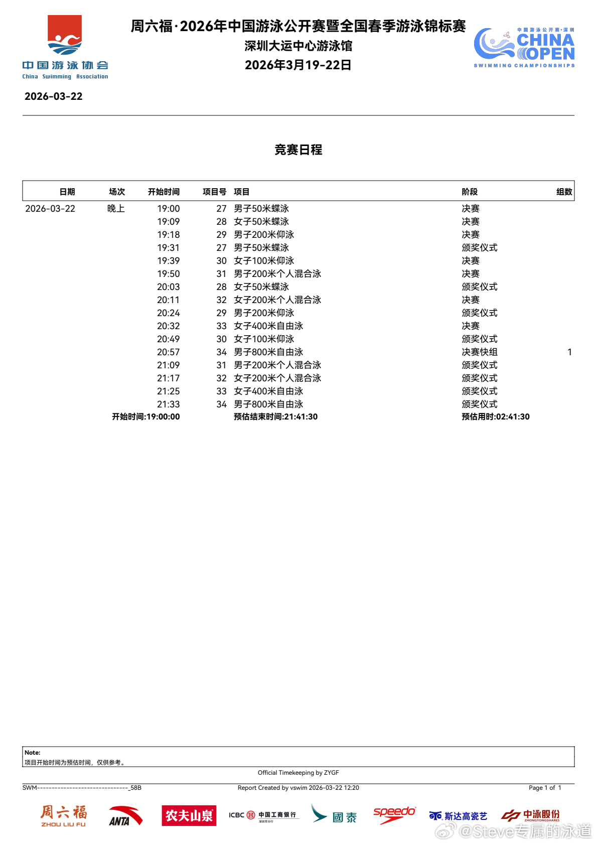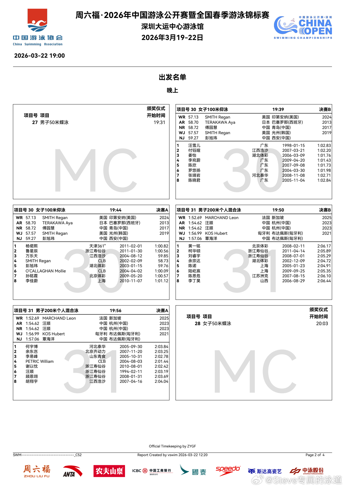 汪顺的2026|2026中国游泳公开赛暨全国春季游泳锦标赛day43.22·决赛赛程/p1第5项|男子200米个人混合泳 决赛A组6道/p2 (预计时间19:50)顺流而上游泳