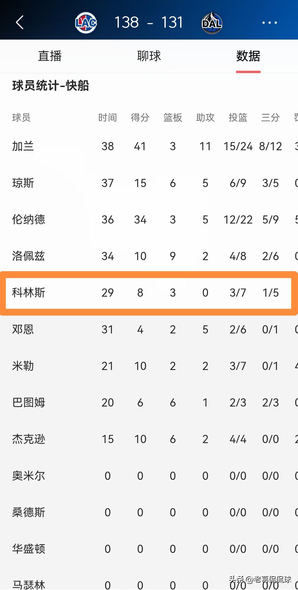 快船大将科林斯真是大失水准!虽然今天快船在客场以138:131战胜独行侠,但是科