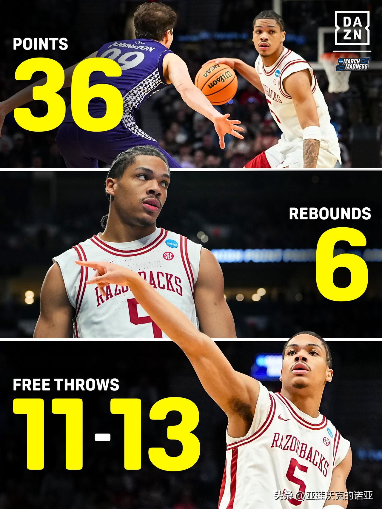 阿肯色主帅卡利帕里赛后被问道最后时刻的关键区别是什么?他回答说,我觉得是那个叫Darius Acuff的孩子,疯狂三月 阿卡夫加入了德里克-罗斯和克里斯-保罗的行列,成为自2004年以来第三位在NCAA锦标赛中多次砍下20分5助攻的新生,简直是猛兽,能够凭借一己之力带领球队杀入四强。