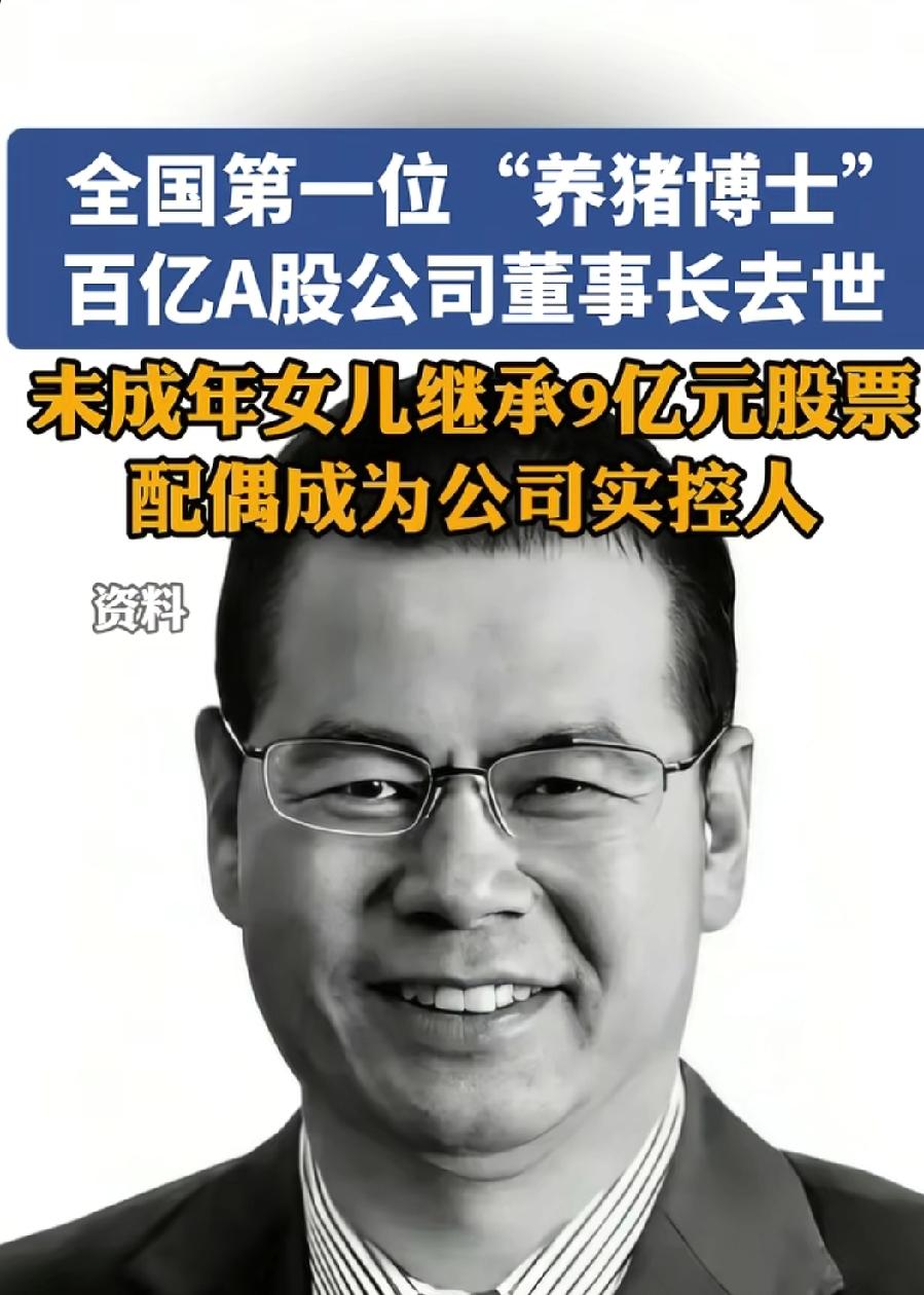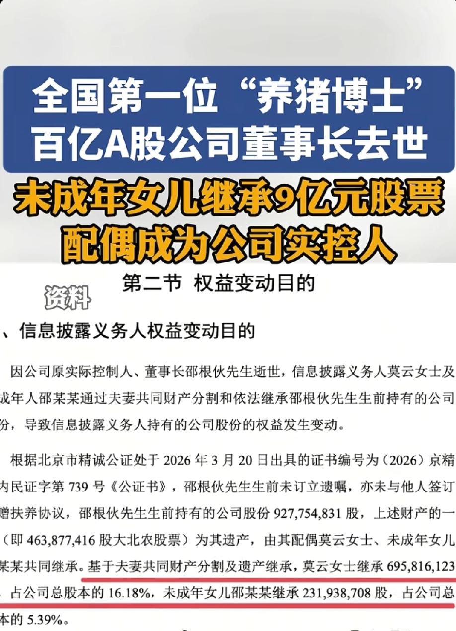 全国首位“养猪博士”、百亿A股大北农董事长邵根伙逝世:未成年女儿继承9亿股票,配偶莫云成实控人。 2026年3月20日晚间,A股百亿市值企业大北农(002385)发布权益变动公告,确认公司原董事长、实际控制人、被誉为全国第一位“养猪博士”的邵根伙于2月3日因病逝世,享年60岁。伴随遗产继承落地,其未成年女儿继承市值约9.46亿元股票,配偶莫云成为公司新任控股股东及实际控制人,这家农业龙头正式进入“后邵根伙时代”。 一、博士创业造百亿帝国,一代养猪巨头落幕 邵根伙是中国农业产业化标志性人物:作为中国农业大学博士,他深耕畜牧与种业,被业内称作**“养猪博士”,1993年创办大北农,从饲料业务起步,逐步构建起涵盖育种、养殖、动保、种业的农业科技版图,推动公司登陆深交所,成长为总市值超170亿元**的行业龙头。他以技术赋能传统农业,用博士思维改造养猪产业,成为产学研结合的典范。 此次公告披露,邵根伙生前直接持有大北农9.28亿股,占总股本21.58%,为公司绝对核心掌舵人。他逝世后未留下遗嘱,遗产按法定继承与夫妻共同财产分割执行。 二、遗产分割落定:女儿继承9亿股票,莫云全权掌控表决权 根据公证与权益分配方案,邵根伙所持股份的50%为配偶莫云所有,剩余50%作为遗产由莫云与未成年女儿共同继承: - 莫云继承6.96亿股,占总股本16.18%; - 未成年女儿继承2.32亿股,占总股本5.39%;按3月20日收盘价4.08元/股计算,对应市值约9.46亿元。 因继承人未成年,其母莫云为法定监护人,女儿所持股份的表决权、提案权、参会权等全部权利由莫云代为行使。权益变动完成后,莫云合计控制公司**21.58%**表决权,足以对股东会决议形成重大影响,正式成为大北农控股股东、实际控制人。 三、平稳交接:公司经营不受影响,治理结构有序过渡 大北农在公告中明确,本次控制权变更基于合法继承,公司生产经营、战略布局、管理团队保持稳定,不会对日常运营与持续发展产生不利影响。作为农业板块核心企业,大北农在生猪养殖、种业科技、饲料生产等领域保持行业领先,此次交接以法治化、市场化方式完成,为A股上市公司实控人变更提供了平稳范本。 从“养猪博士”白手起家到百亿帝国,邵根伙书写了中国农业科技创业者的传奇;而配偶代持、未成年子女继承的安排,既保障了家族权益,也守住了公司治理底线。随着莫云接掌大权,大北农能否延续技术驱动、稳健扩张的路线,将成为市场关注焦点。中国第一个“养猪博士”邵根伙去世