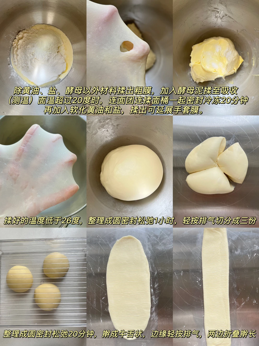 ❷气温高时,需要控制面温,液体类和粉类分开各自冷冻1个小时,和面钩和搅拌桶也需要冷冻。也可以用水合法揉面或者搅拌桶绑冰袋揉面,也可以在空调房温度开低点揉面。